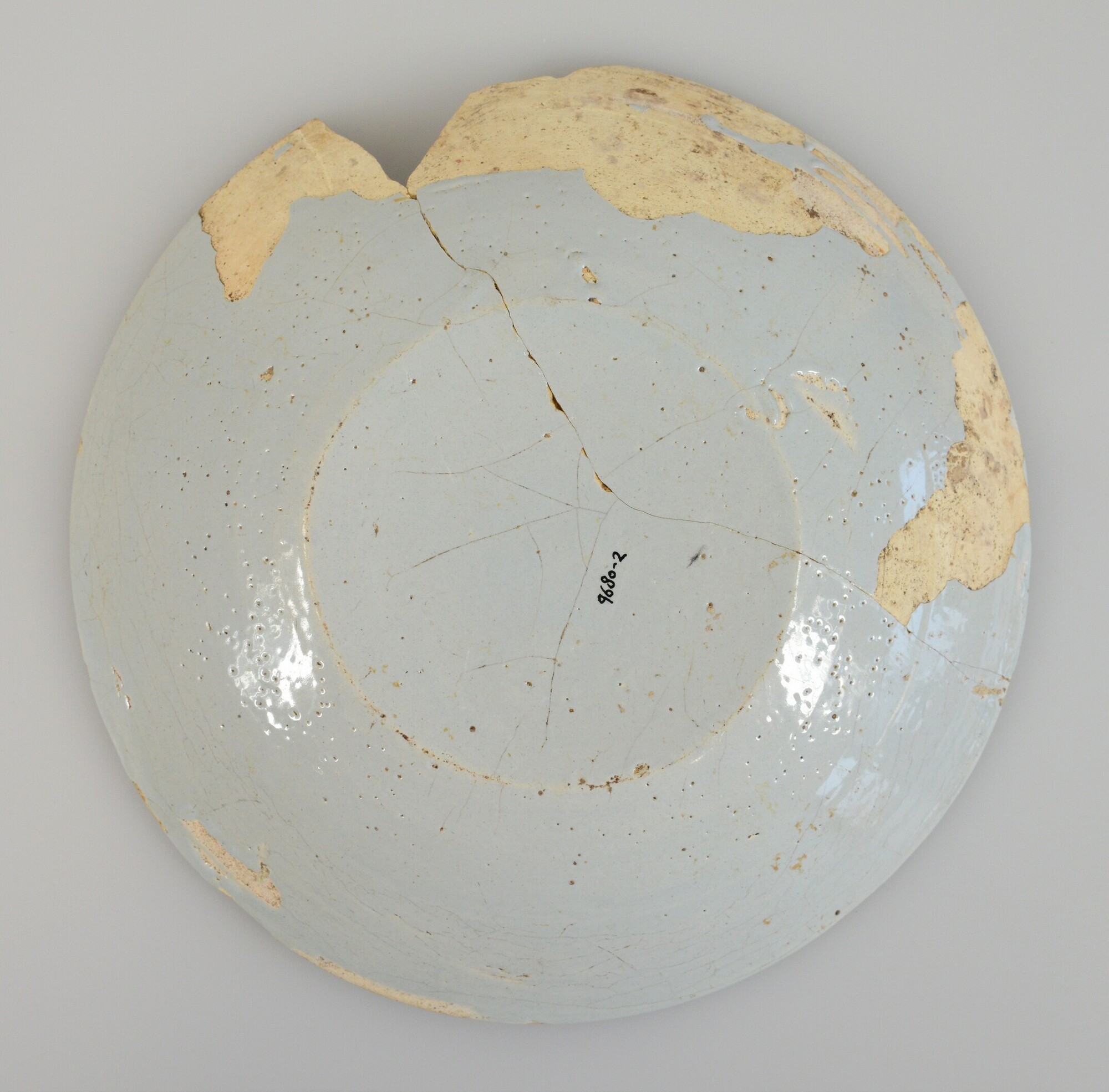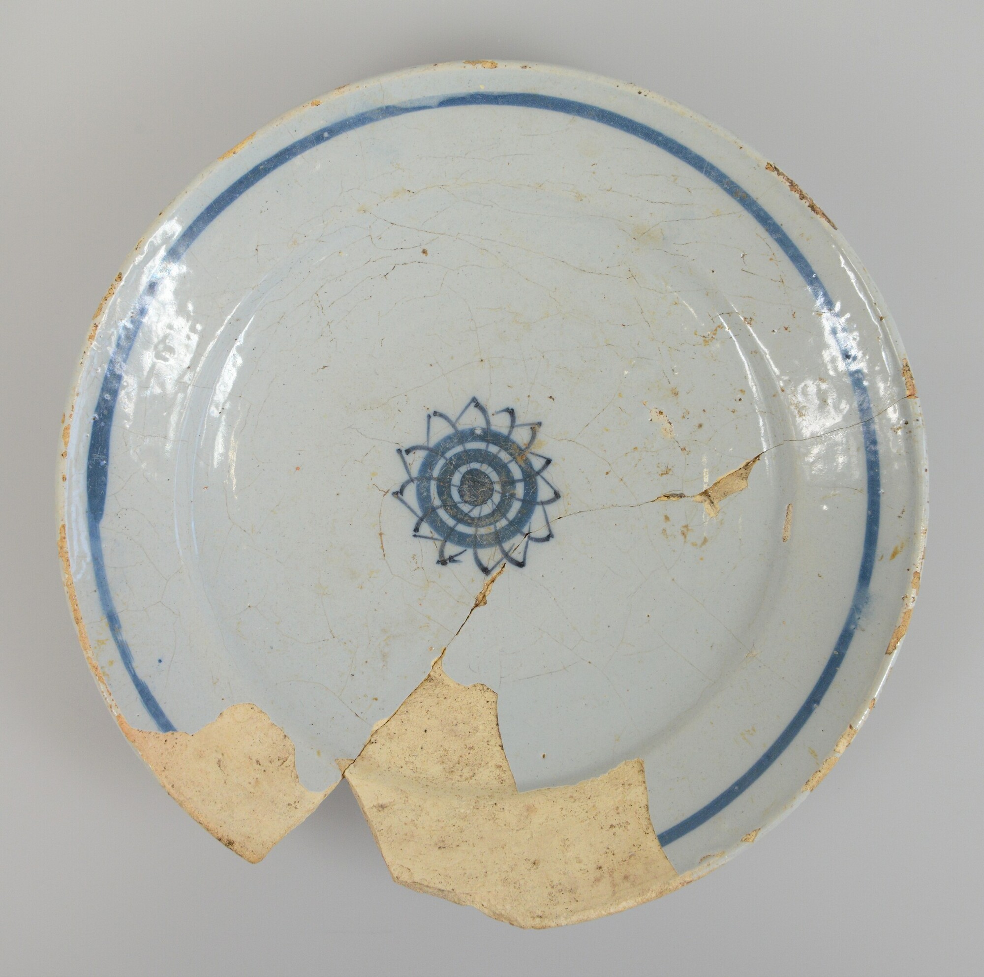 Bord; f-bor-3; afgerond bord op standvlak en met vrij brede vlag; faience; tinglazuur; blauwe beschildering: concentrische cirkel en rozet; standvlak; herkomst: Nederland