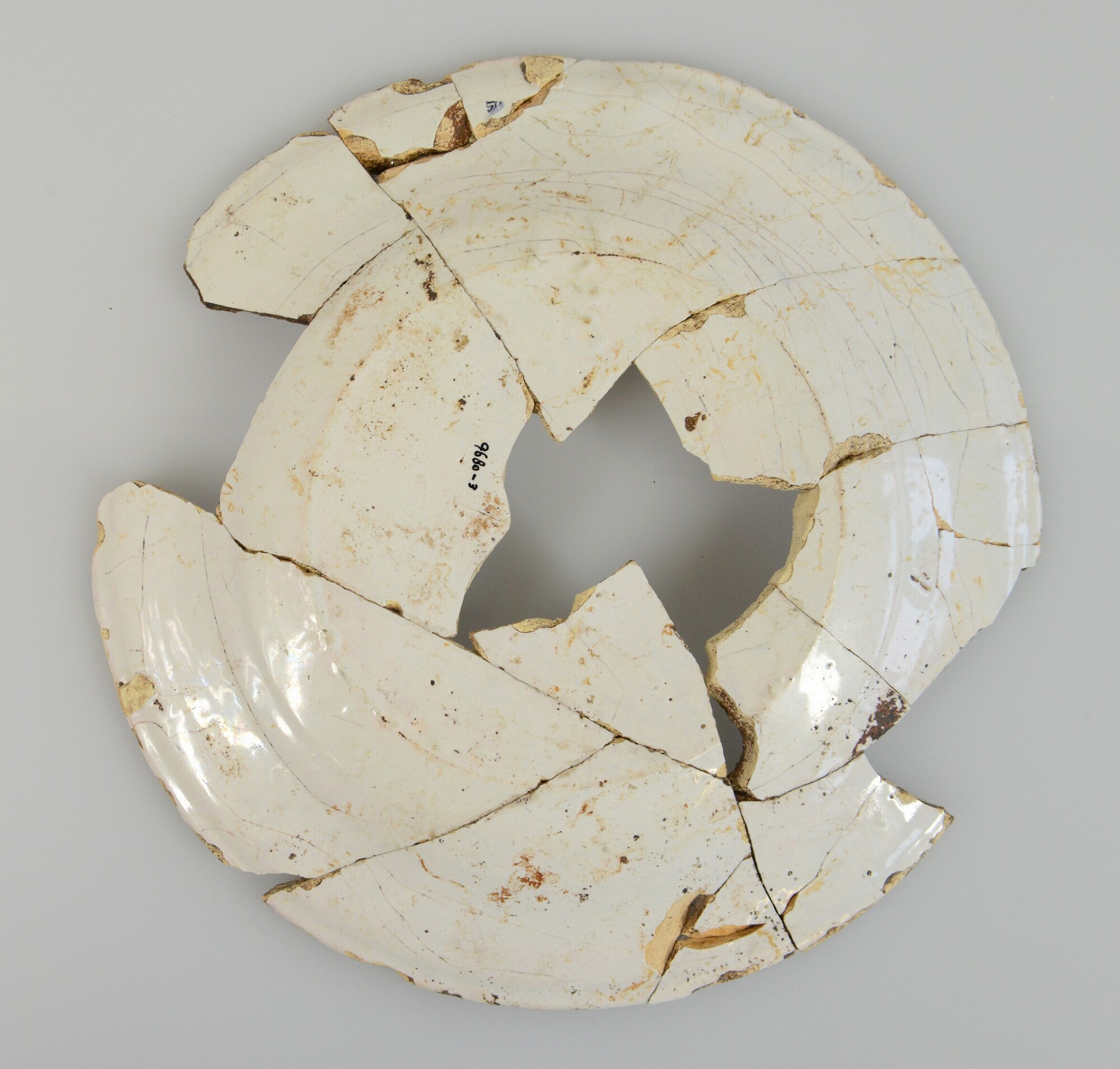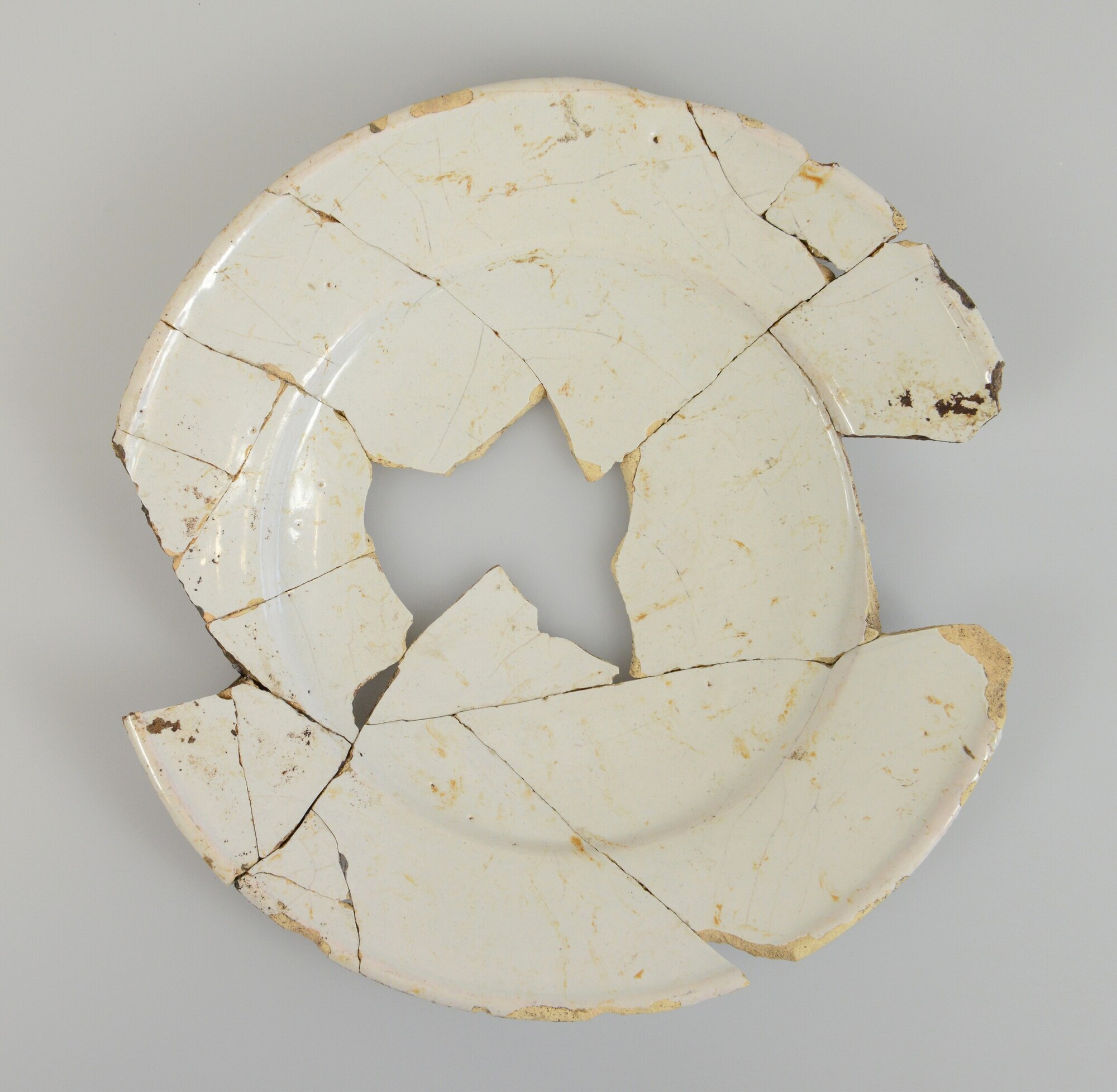Bord; f-bor-2; plat bord met platte spiegel, platte vlag inwendig met knik afgezet; faience; tinglazuur; geheel wit; standvlak; herkomst: Nederland