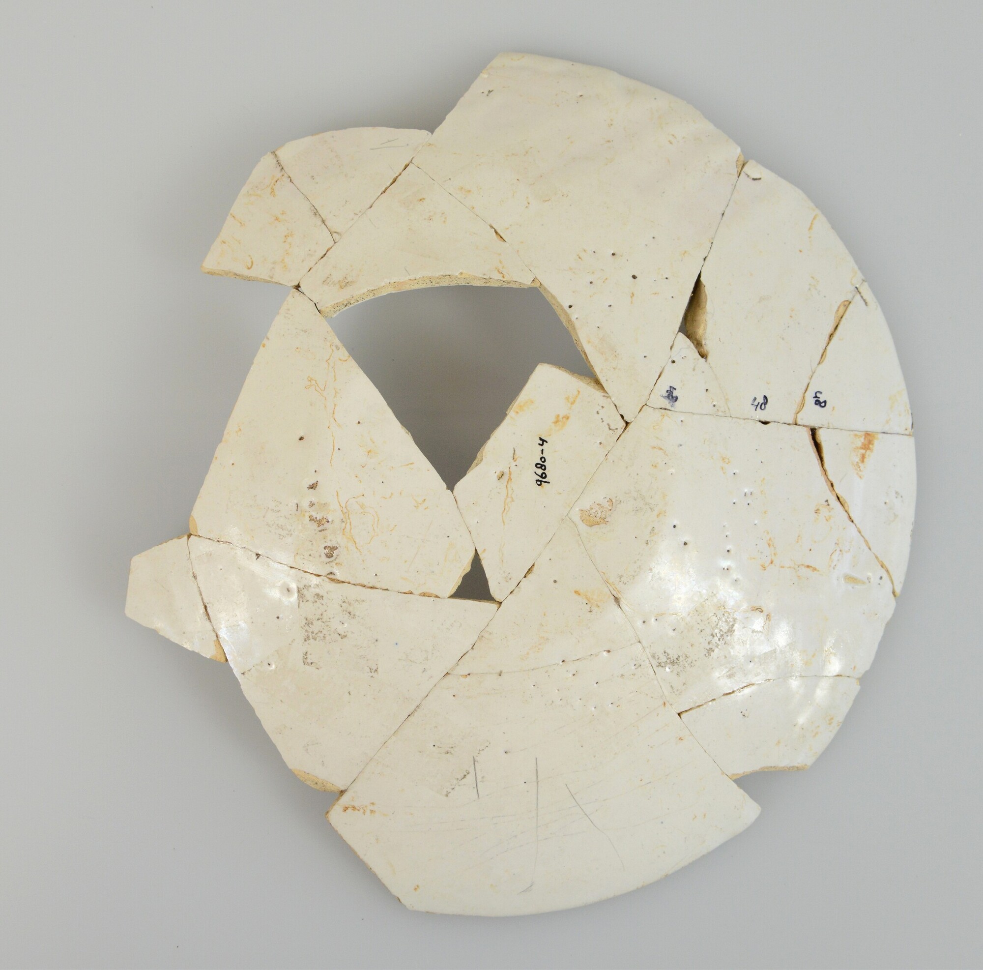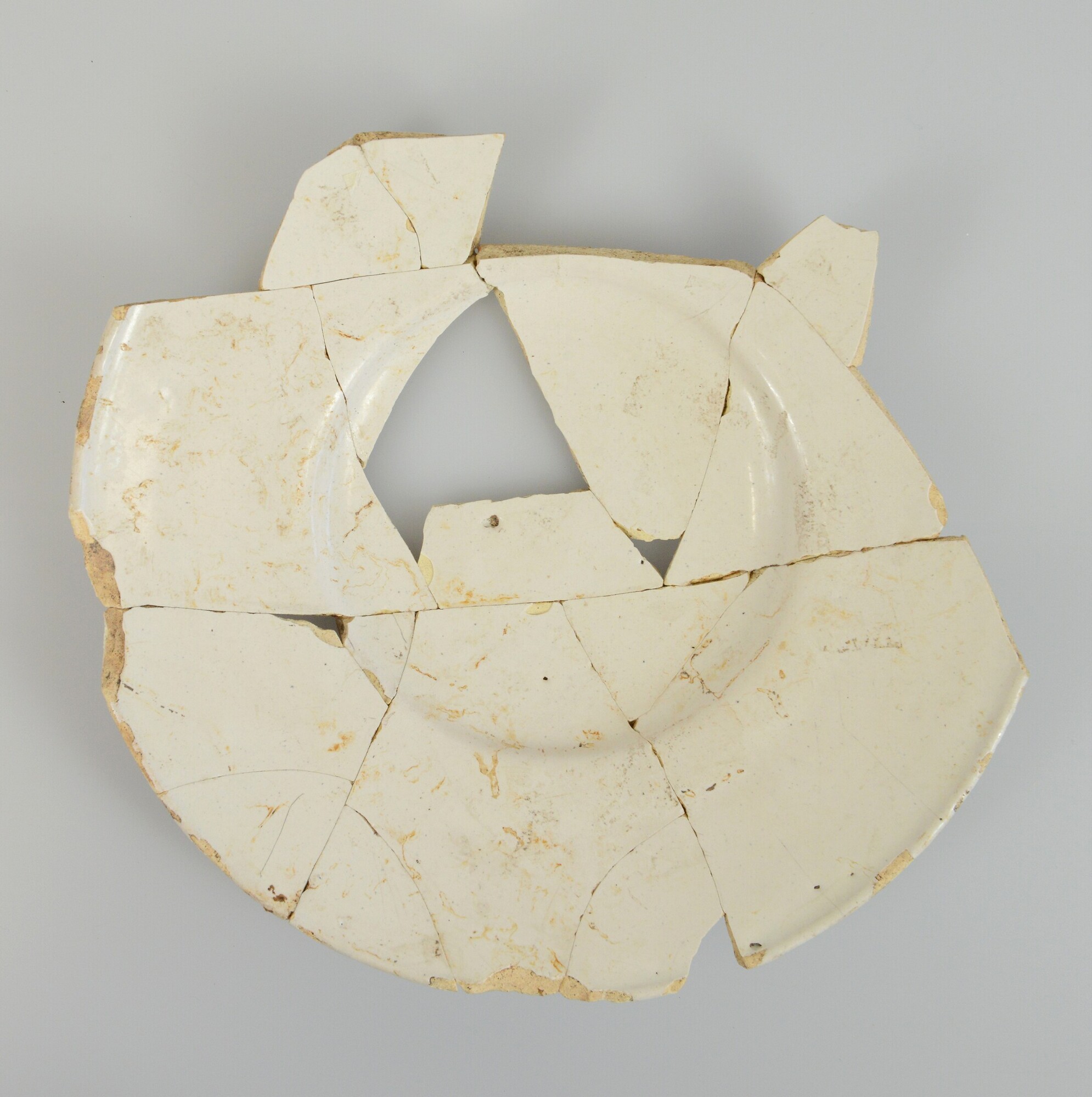 Bord; f-bor-19; plat bord met platte spiegel, zeer brede vlag, inwendig met knik afgezet; faience; tinglazuur; geheel wit; standvlak; herkomst: Nederland