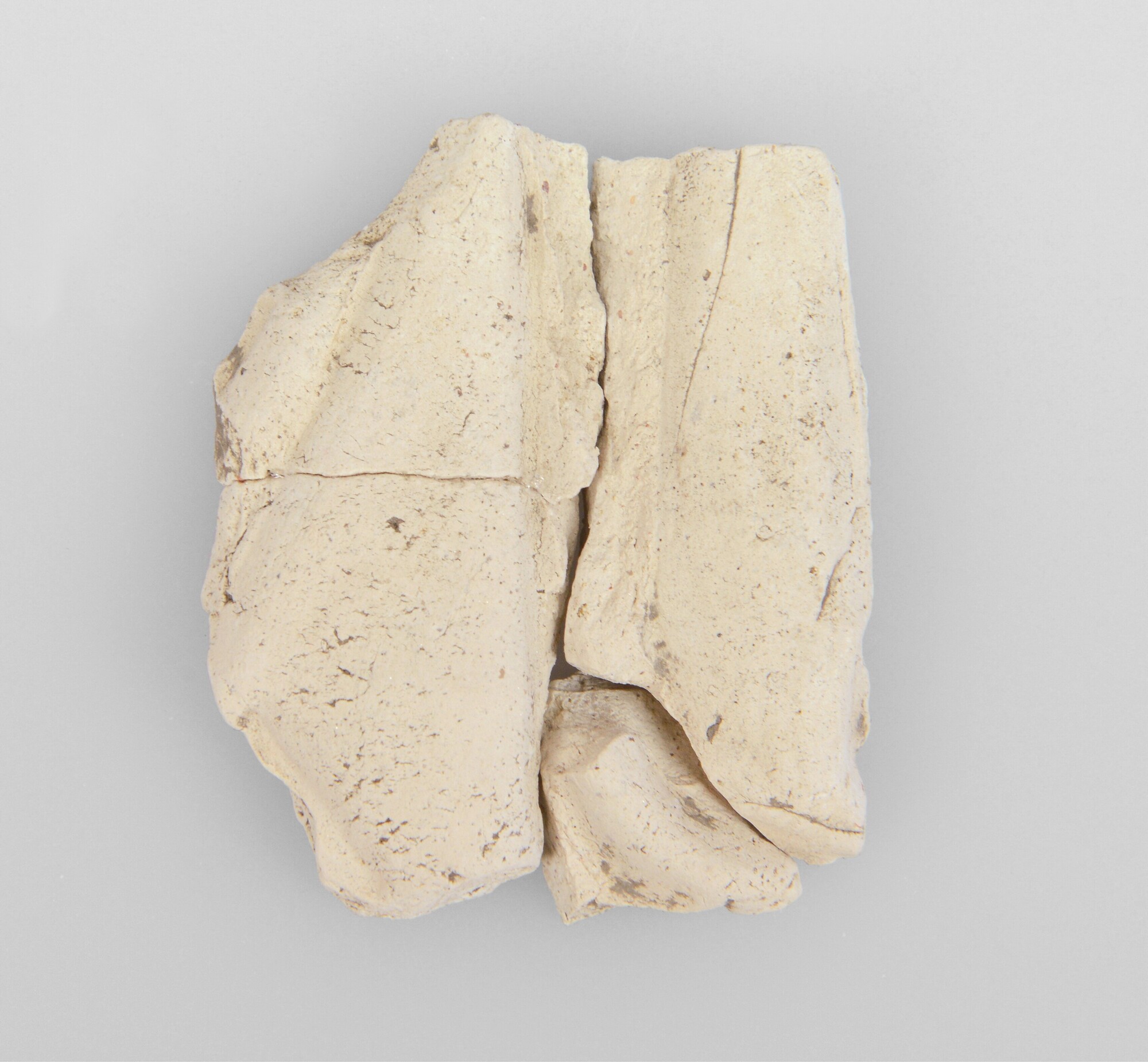 Heiligenbeeld; pij-bee-; drie fragmenten plooival groot hol beeld. Afbeelding van vermoedelijk Maria,Catherina of Barbara; herkomst: vermoedelijk Utrecht