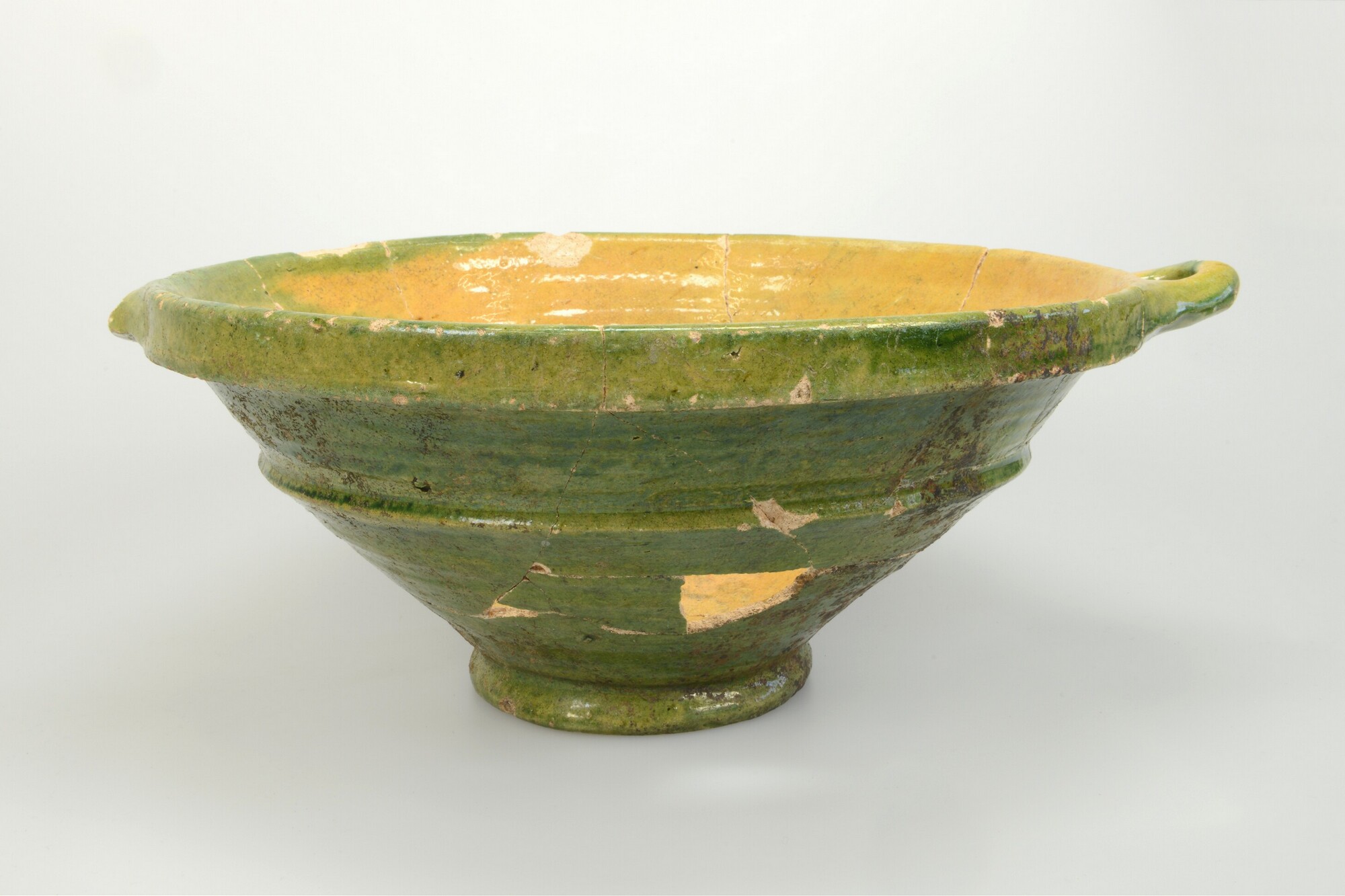 Kom; w-kom-15; diepe bolle kom met ribbel op buik en kraagrand; witbakkend aardewerk; loodglazuur, uitwendig met koperoxide; standring; twee horizontale worstoren; herkomst: Nederland