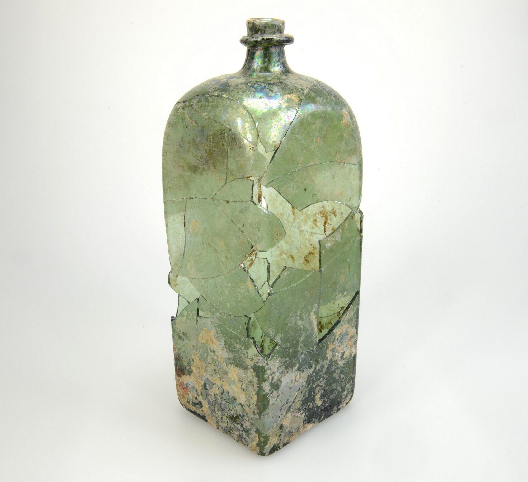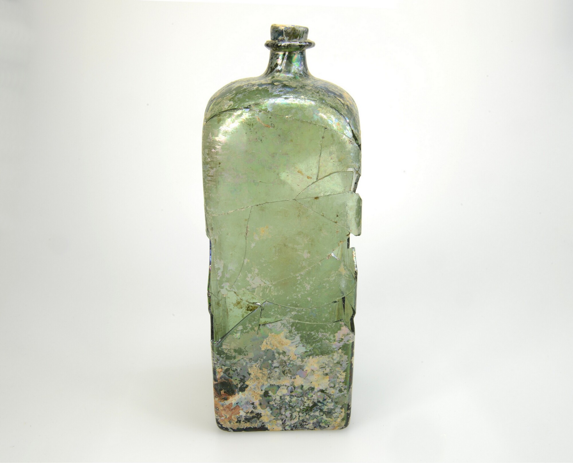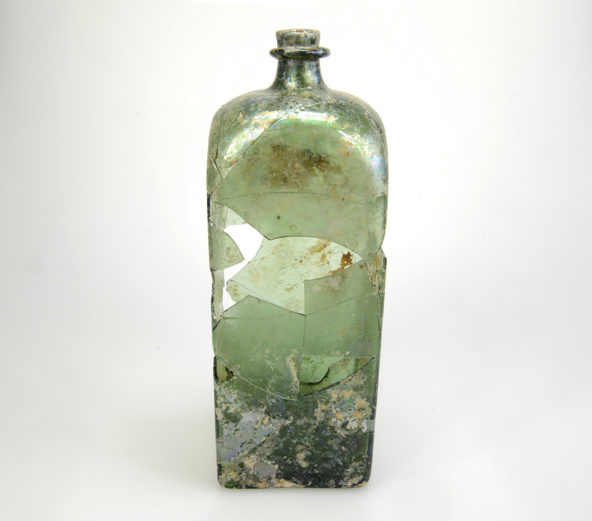 Kelderfles; gl-fle-7; hoge vierzijdige fles, met korte hals, standvlak op licht opgestoken bodem met pontilmerk; groen glas; herkomst: Duitsland of Nederland ?