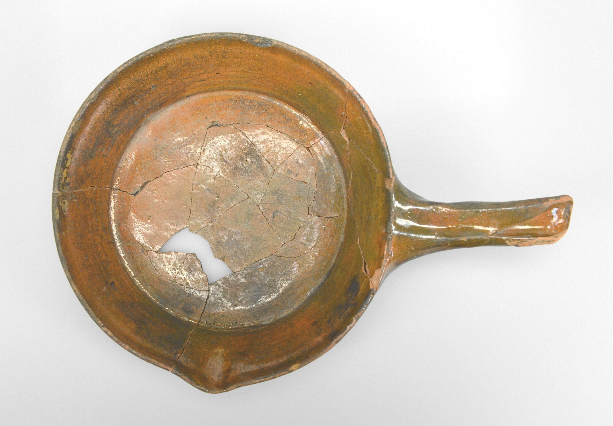 Steelpan; r-bak-6; bakpan met hoge kraagrand; roodbakkend aardewerk; in- en uitwendig loodglazuur; iets bolle bodem; één massieve steel; schenklip op 90 graden t.o.v. steel