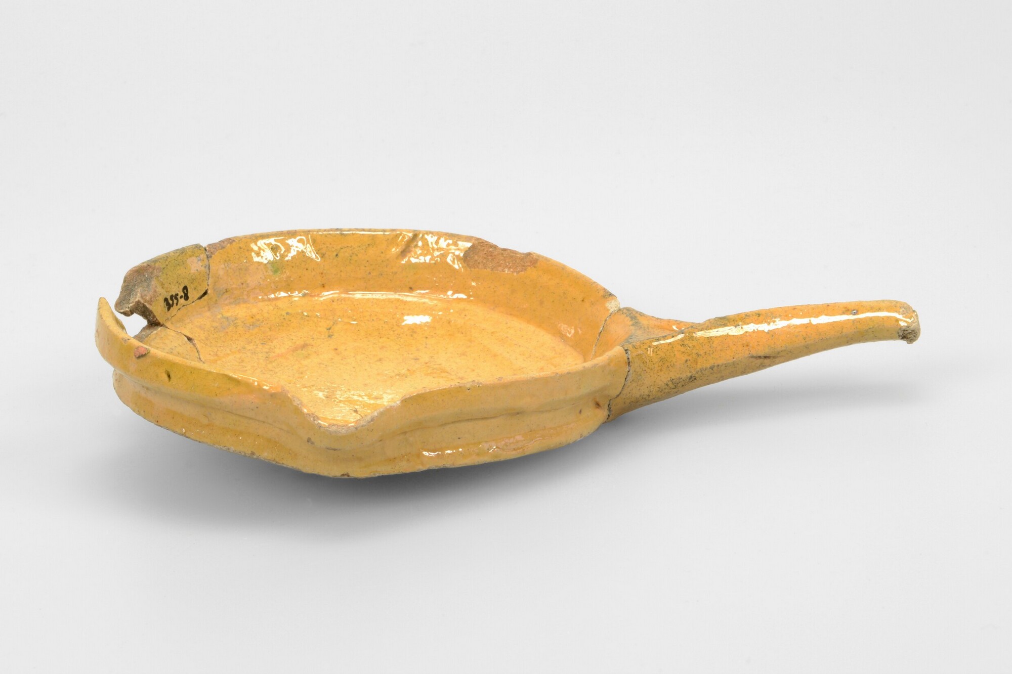 Steelpan miniatuur; w-bak-3; bakpan met kraagrand; witbakkend aardewerk; in- en uitwendig loodglazuur; toegevouwen steel; schenklip op 90 graden t.o.v. steel