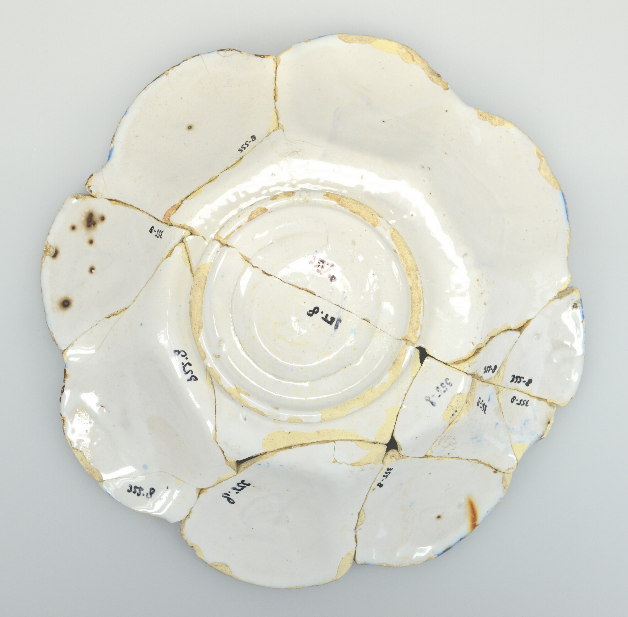 Plooischotel; f-plo-3; plooischotel met scherpe knik spiegel-vlag en geplooide vlag; 8 lobbig; Nederlandse faience; tinglazuur; op spiegel blauwe beschildering: twee Chinezen in landschap; standring zonder doorboring; herkomst: West-Nederland