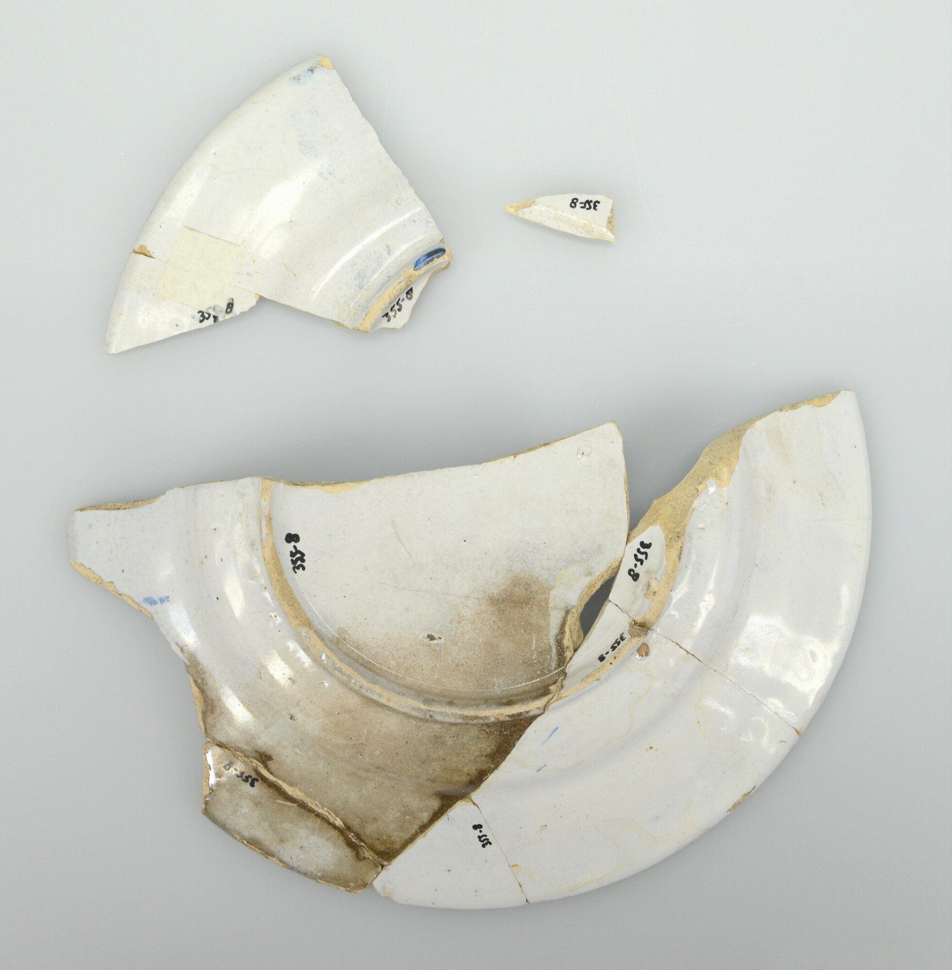 Bord; f-bor-1; bord met knik spiegel-vlak; Nederlandse faience; tinglazuur; blauwe beschildering: Chinezen in landschap; standring met doorboring; herkomst: West-Nederland