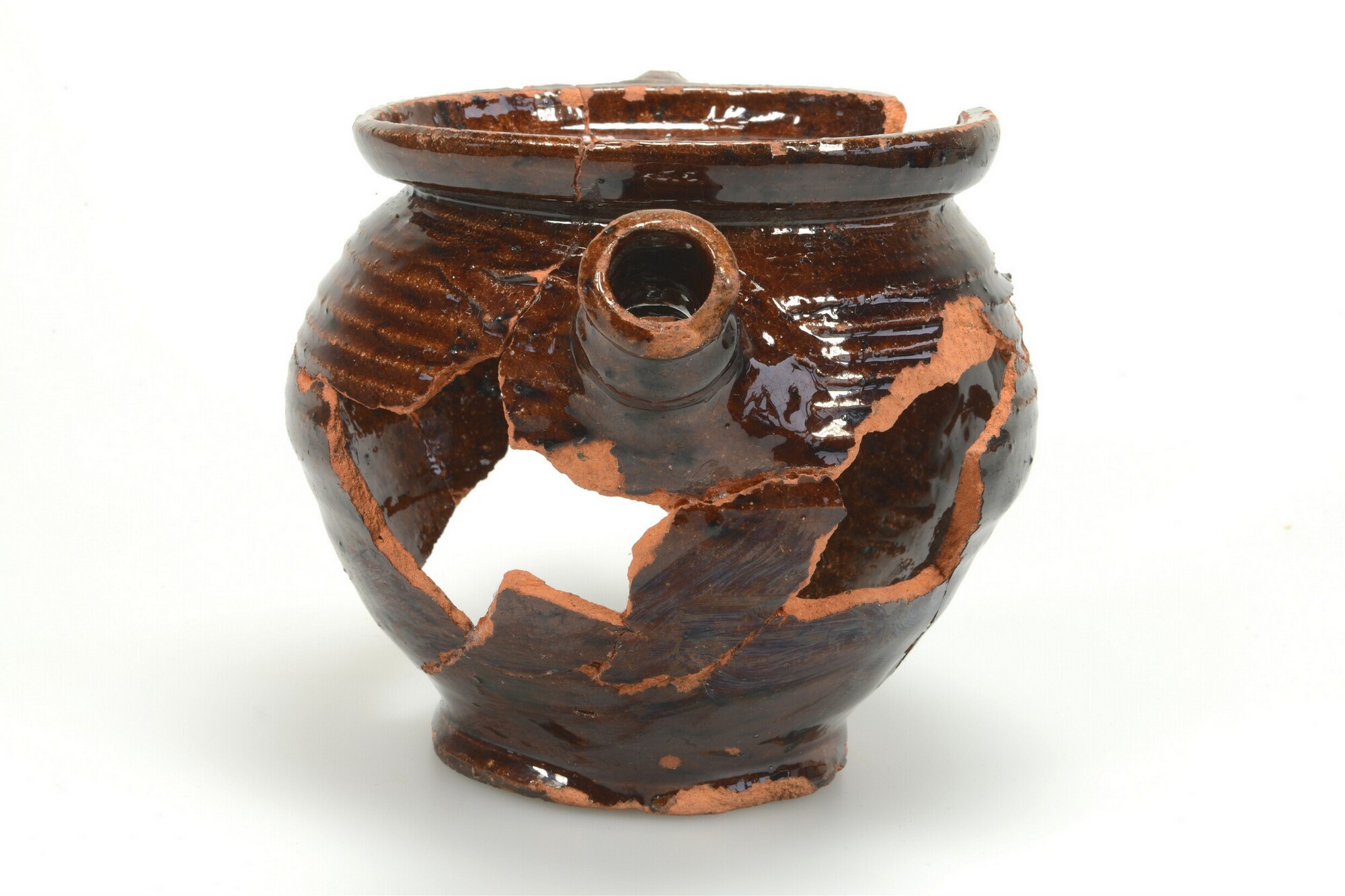 Tuitkan/pot; r-pot-91; pot met afgeronde kraagrand; roodbakkend aardewerk; in- en uitwendig loodglazuur met mangaanoxide; standvlak; één toegeknepen lintoor; schenktuit