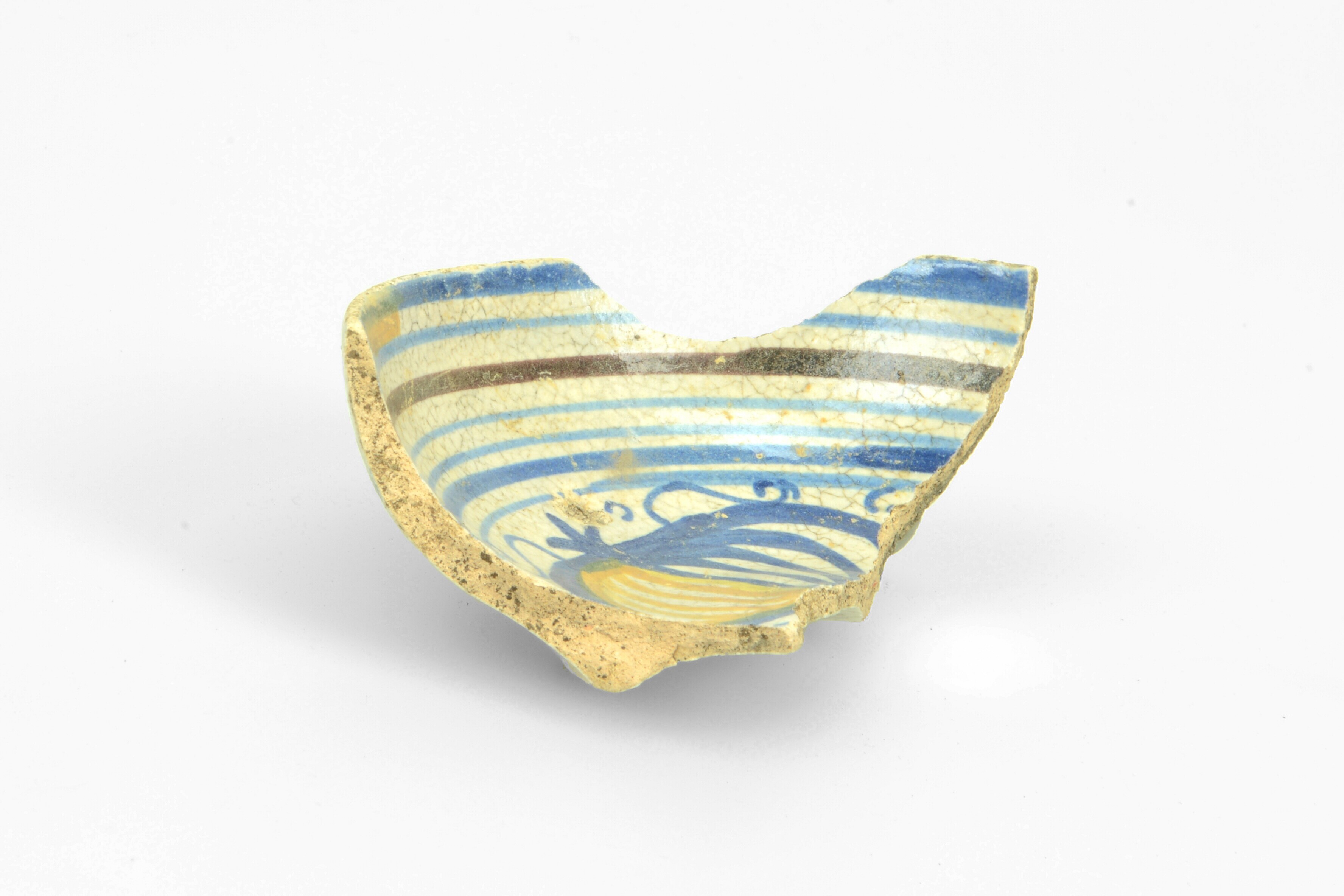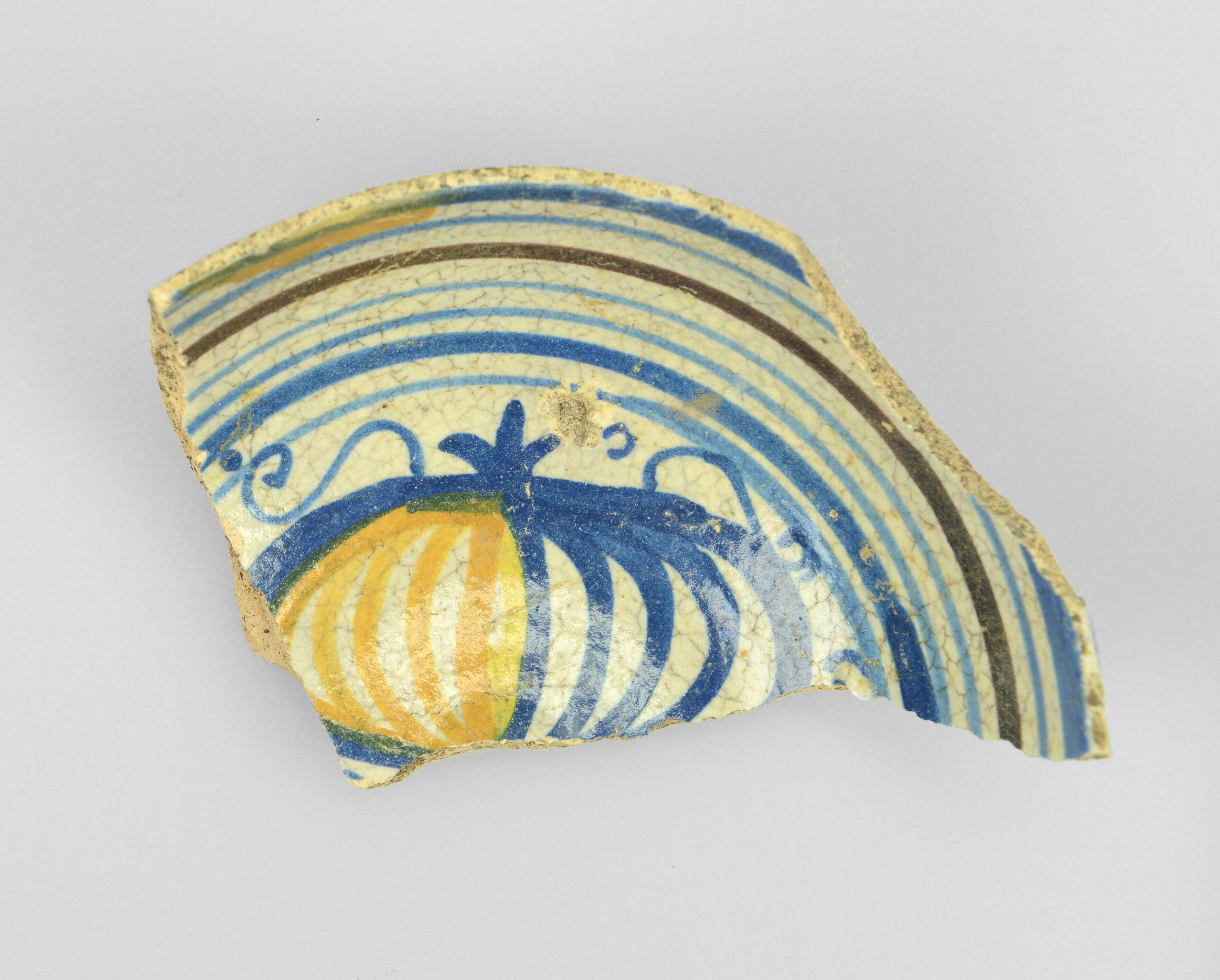 Kom; m-kom-4; bolle kom met rechte rand; tinglazuur inwendig, loodglazuur uitwendig; paars/geel/bruin op wit: granaatappel en blauwe en paarse banden; concaaf standvlak; herkomst: Nederland