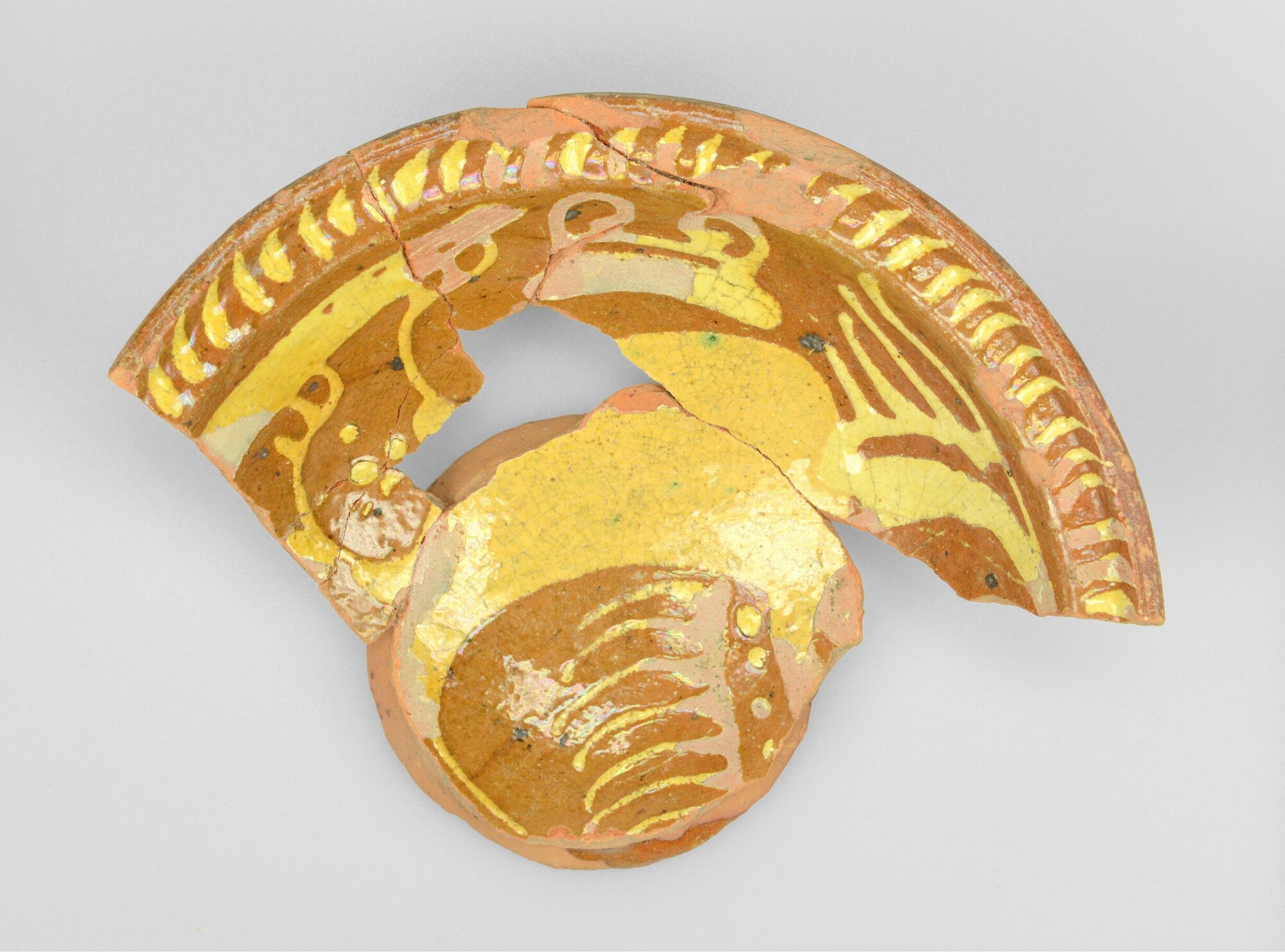 Kom; r-kom-58; bolle kom met haaks naar buiten geknikte rand, aan buitenzijde aangedrukt; North Holland Slibware; roodbakkend; loodglazuur, slib; vogel met vuurslag en kabelrand; standring; herkomst: Noord-Holland