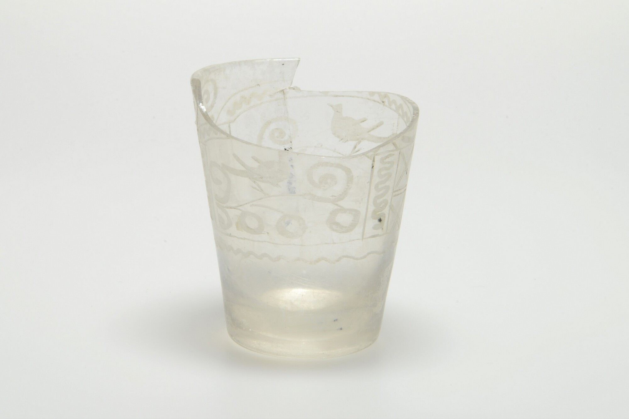 Beker; gl-bek-6a; glas; kleurloos; golflijnen, gestileerd floraal motief; standvlak; ruw weggeslepen p-merk; vormgeblazen; herkomst: Bohemen?