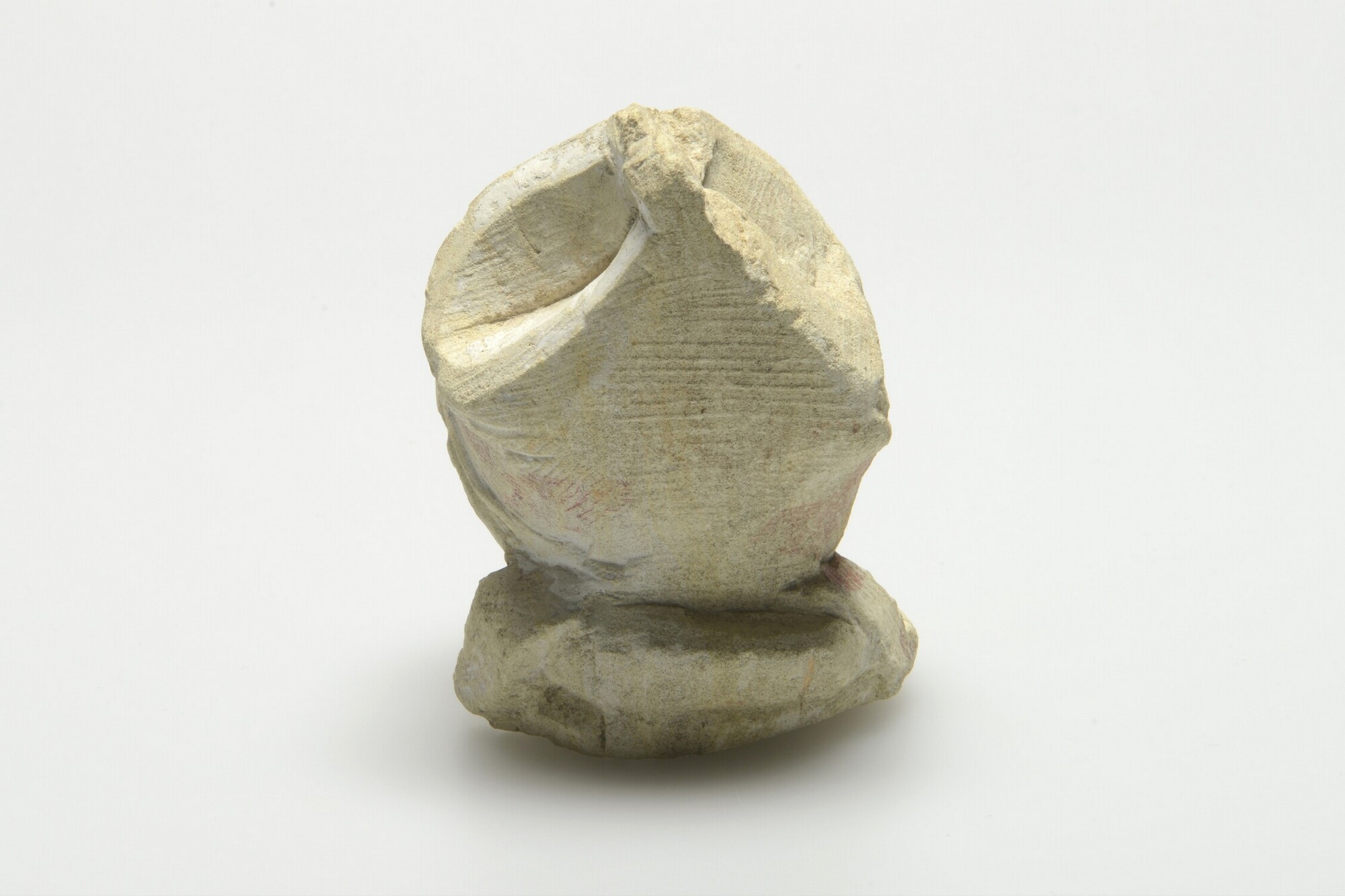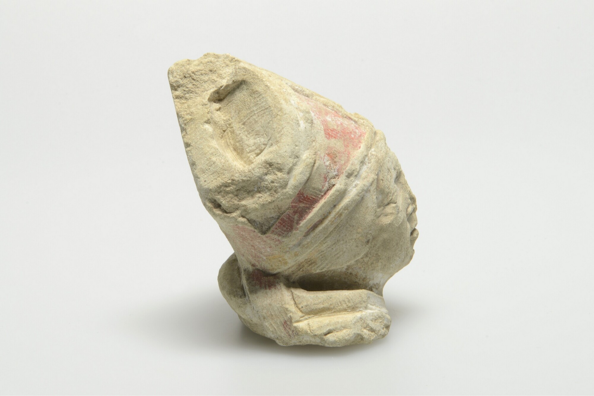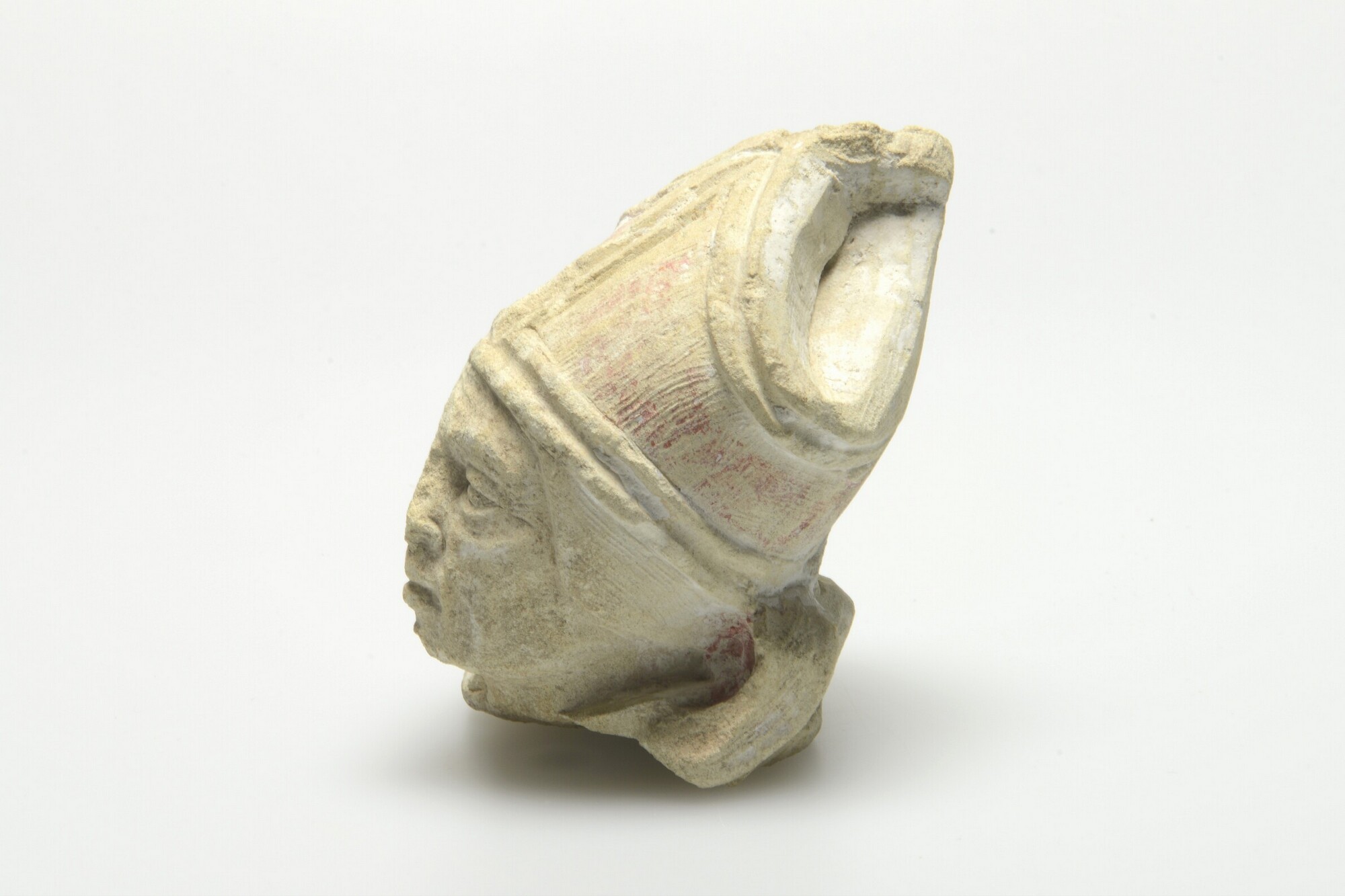 Sacramentshuis, fragment; bisschopskopje (voorstelling van Ambrosius, Augustinus?) polychromie op de mijter
