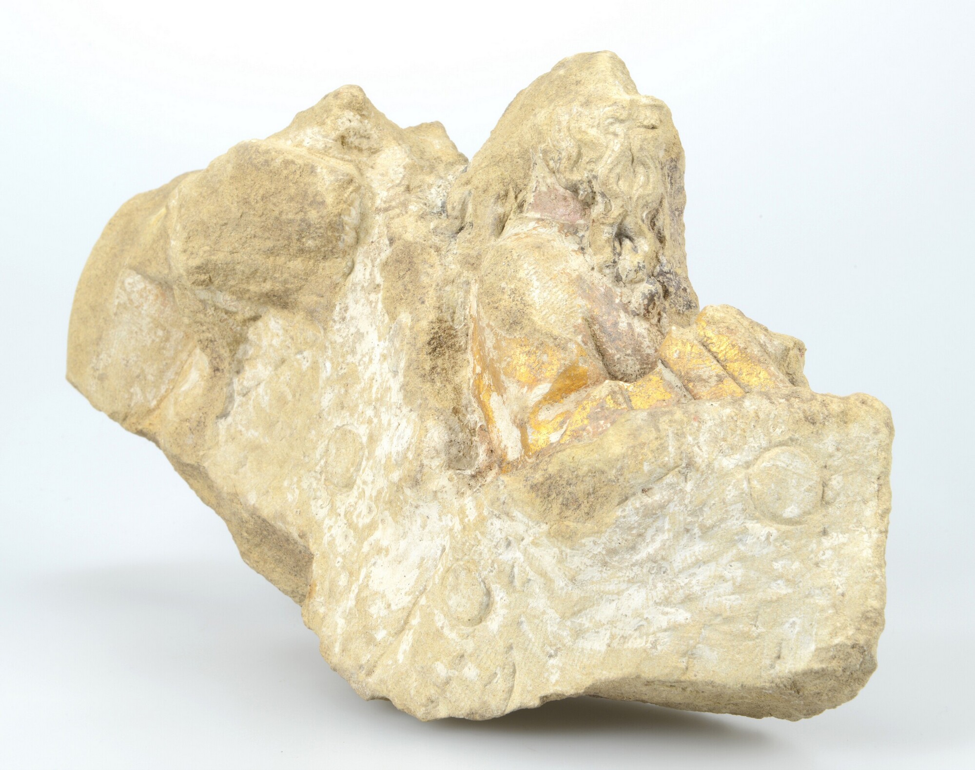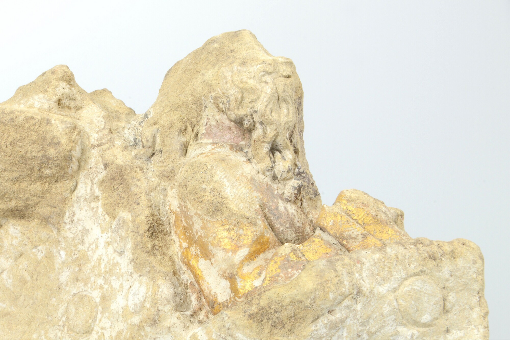 Sacramentshuis, fragment; baardige man zittend in de mannaregen. Polychromie op het gelaat.