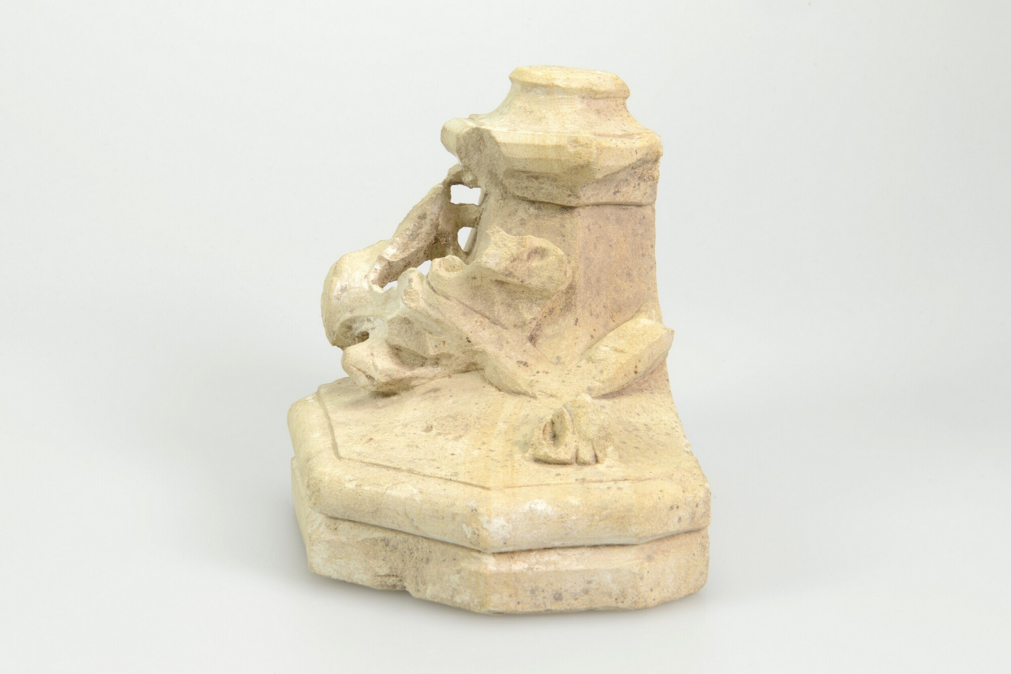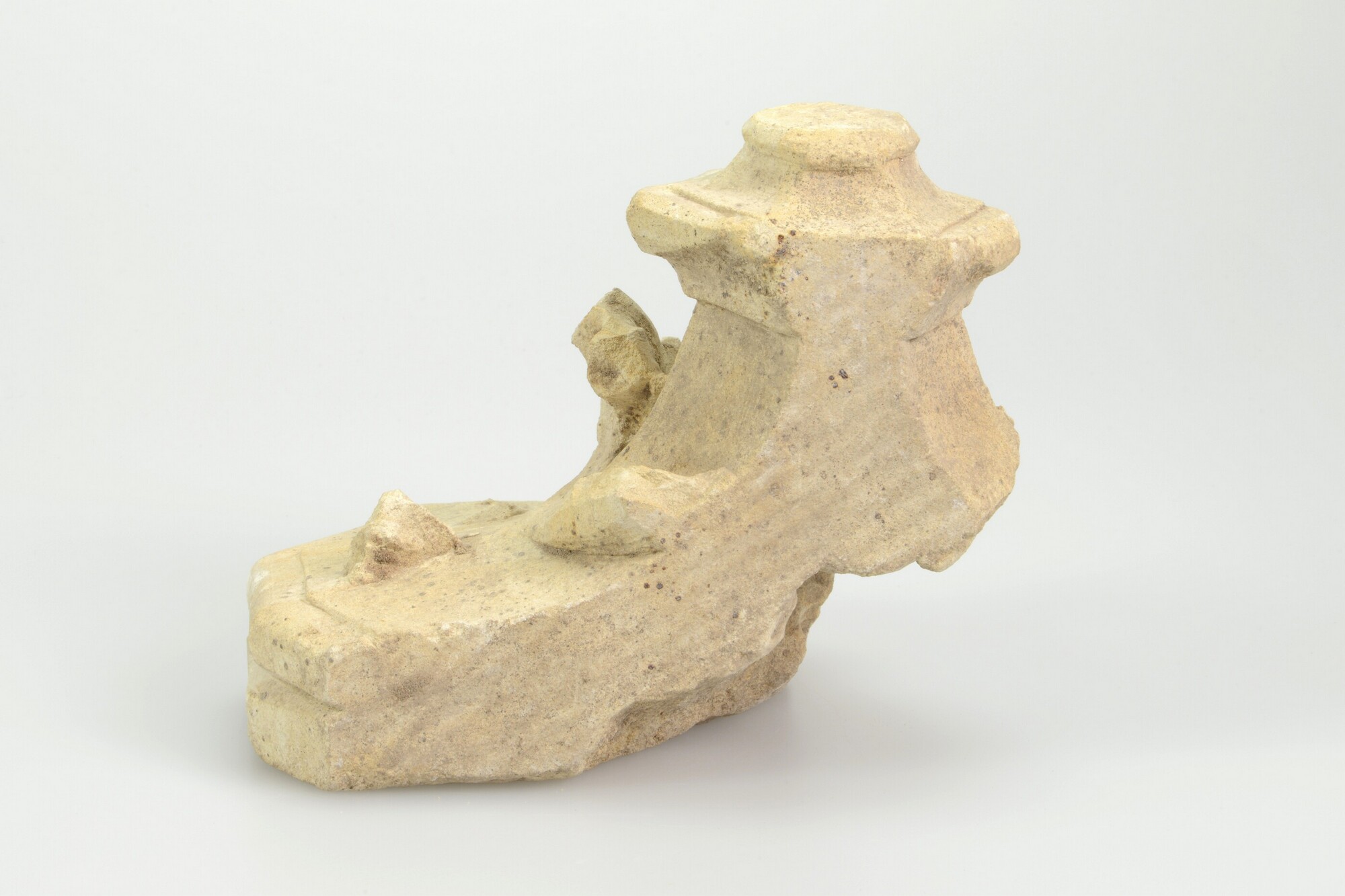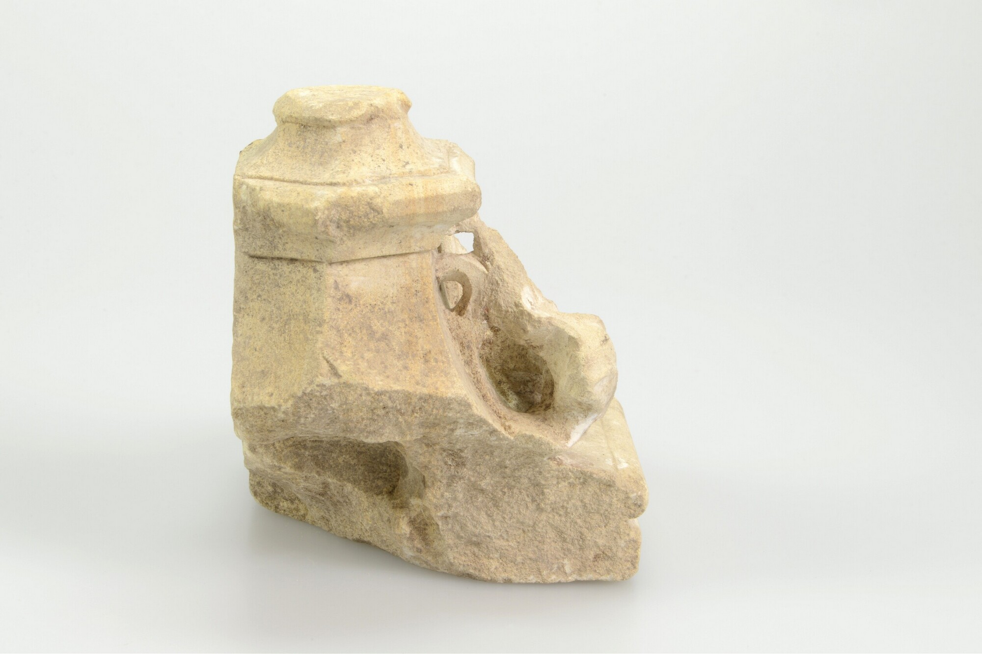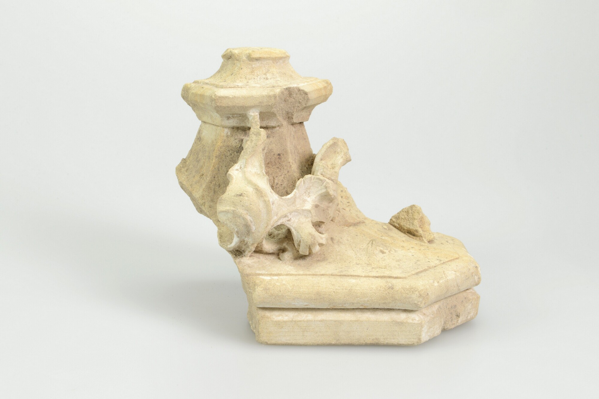 Sacramentshuis, fragment; console-achtig onderdeel van een overhuiving of een kapiteel/console. Grillige bladvormen rondom. Aan de onderzijde een ingegraveerd kruis. Aan de achterzijde een vierkant dookgat.