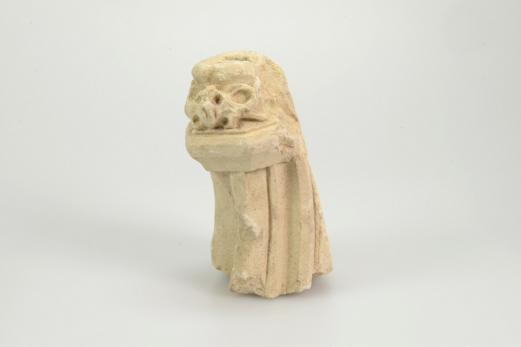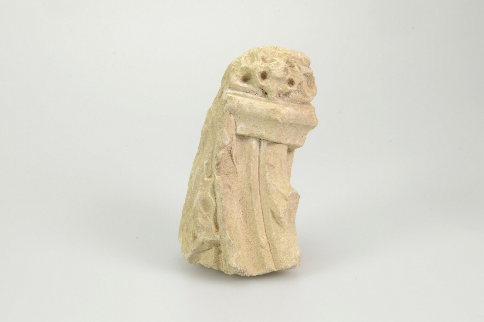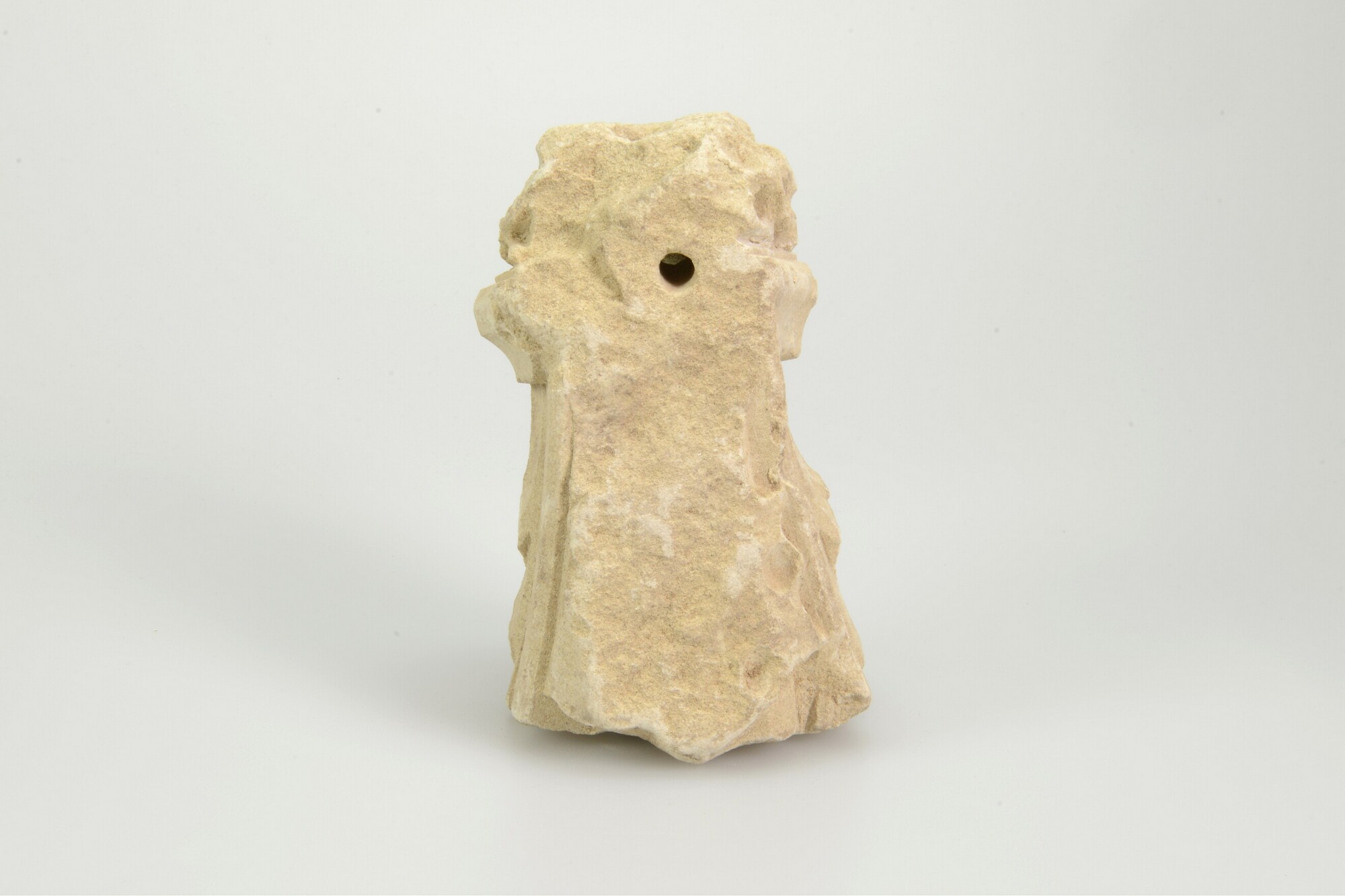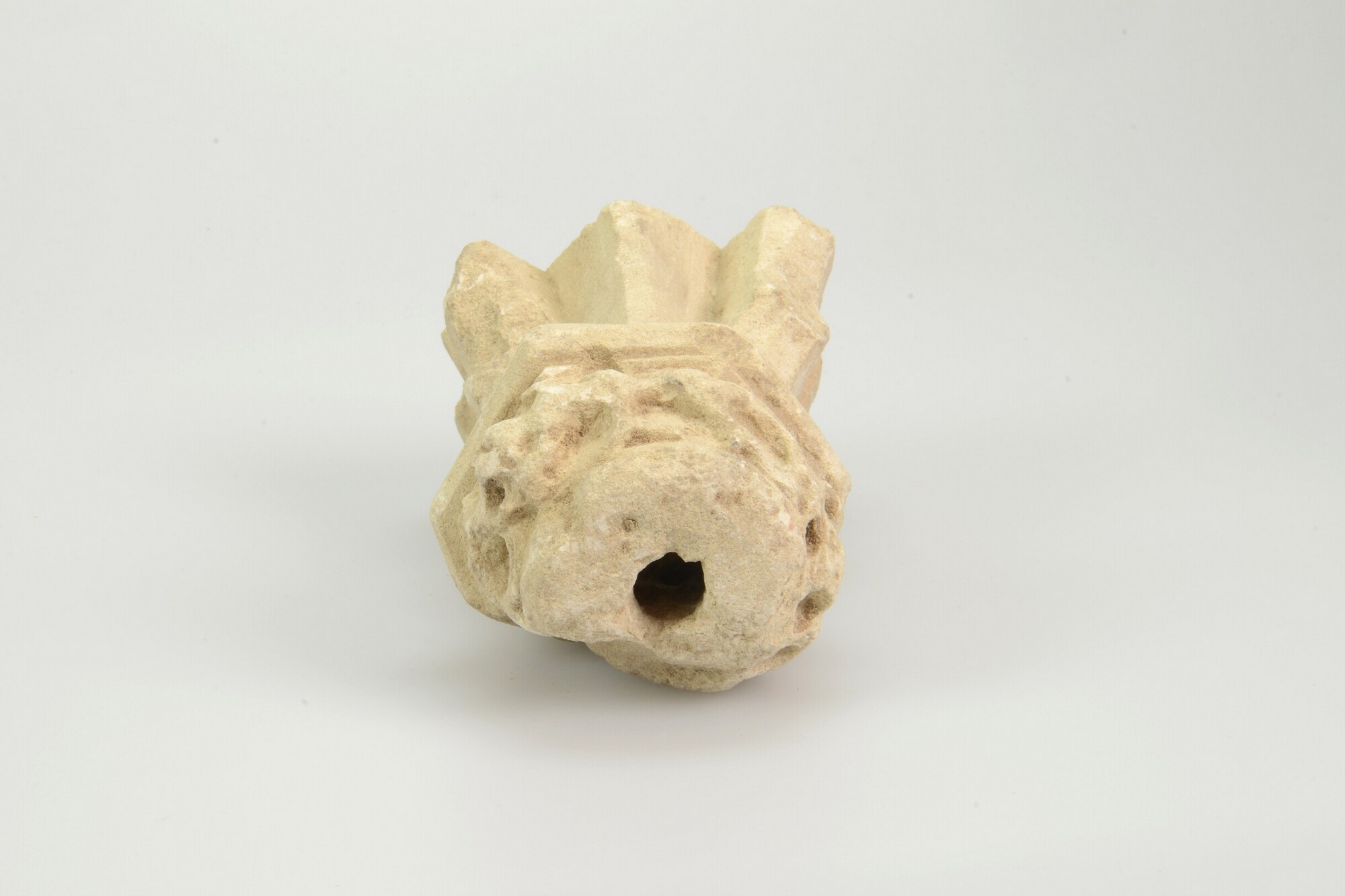Sacramentshuis, fragment; kapiteel met de aanzetten van een driepas en een rib. Tussen deze aanzetten en het kapiteel een zeshoekige dekplaat. Het kapiteel is versierd met bladwerk. Aan de onderzijde van het kapiteel een vierkant dookgat. Tussen het kapiteel en de dekplaat een rond dookgat, dat met het vierkante dookgat in verbinding staat.