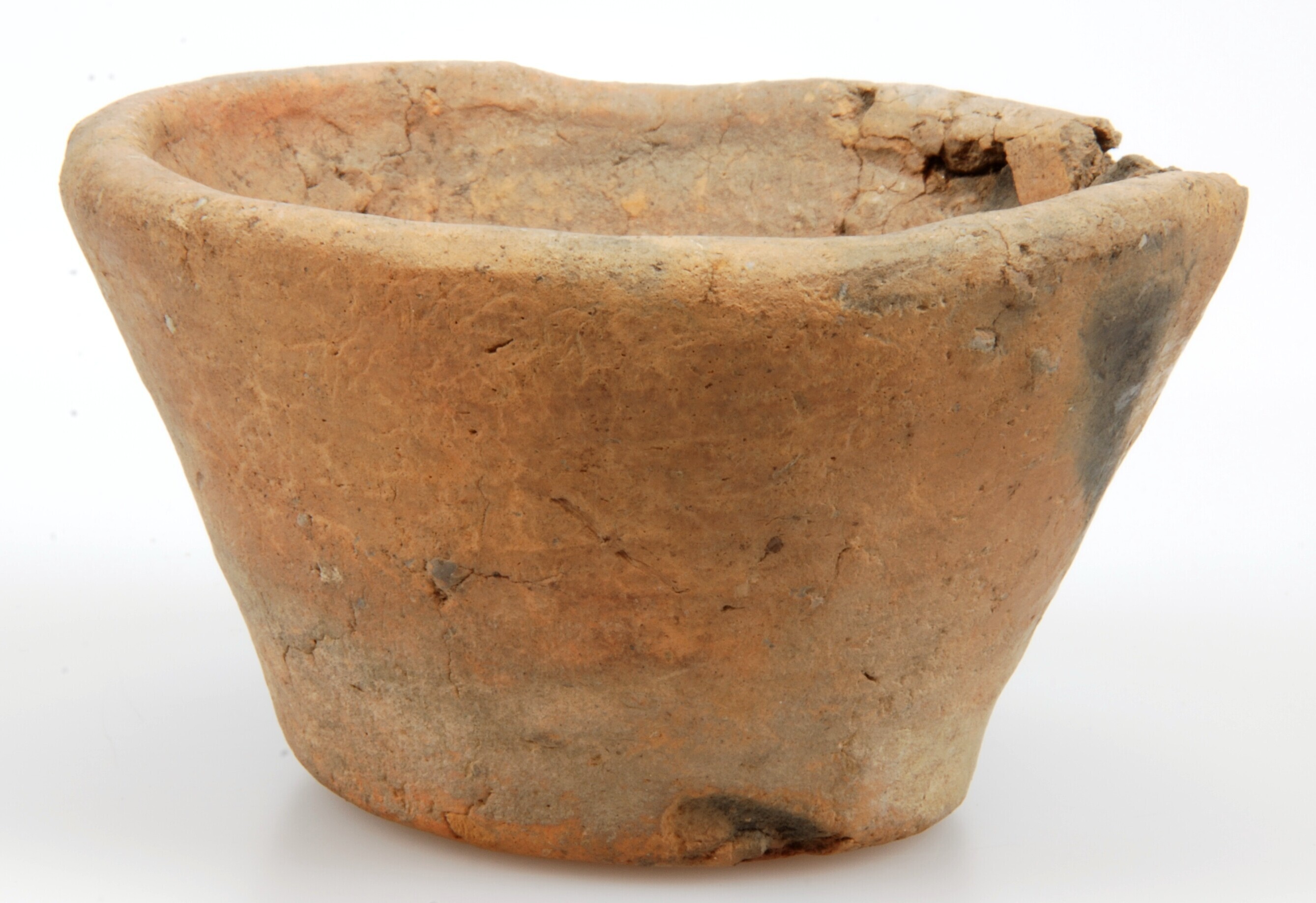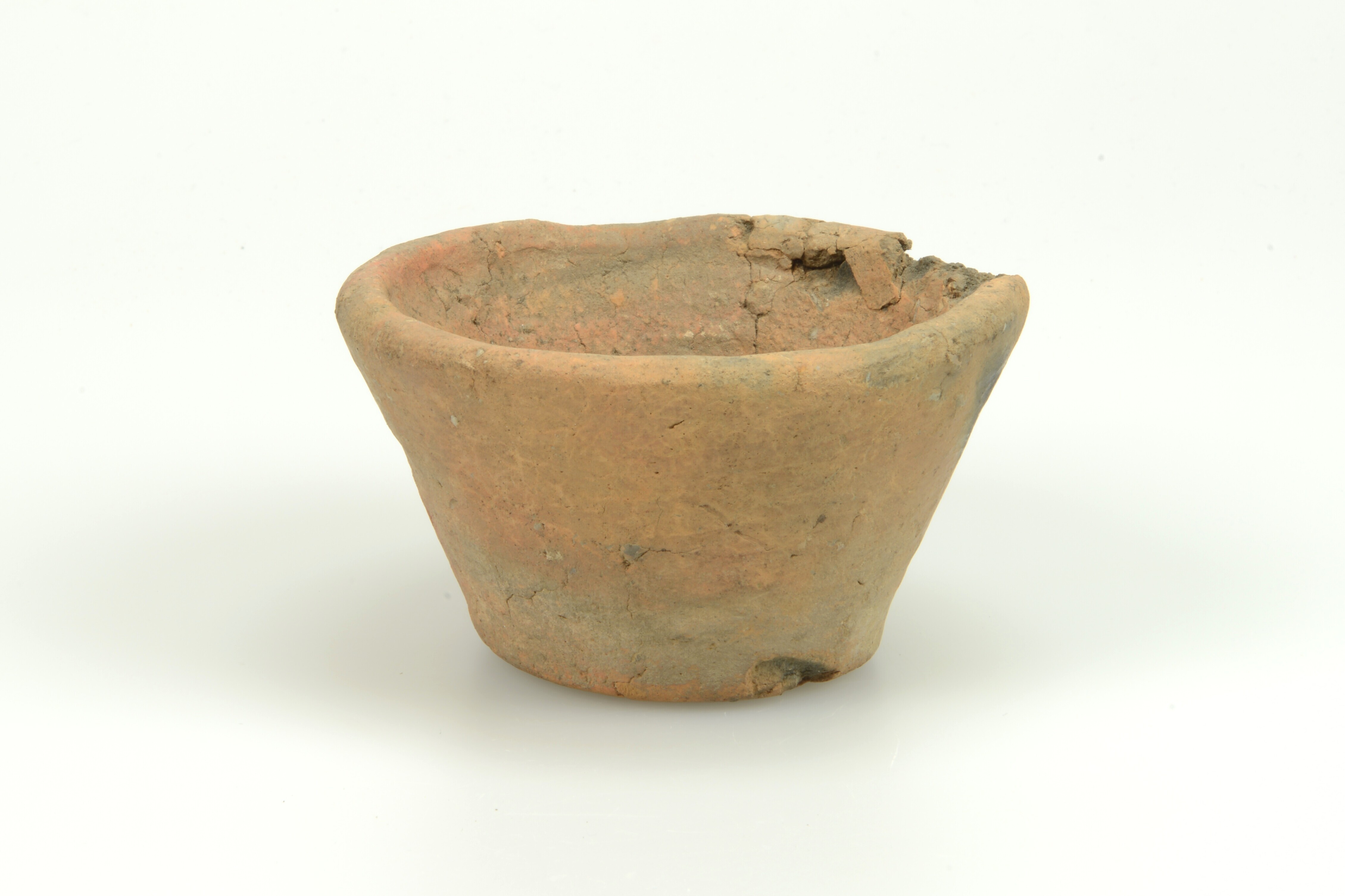 Urn; trechtervormig met standvlak en afgeplatte, onregelmatig gevormde rand; steengruismagering; 8 gecalcineerde botjes