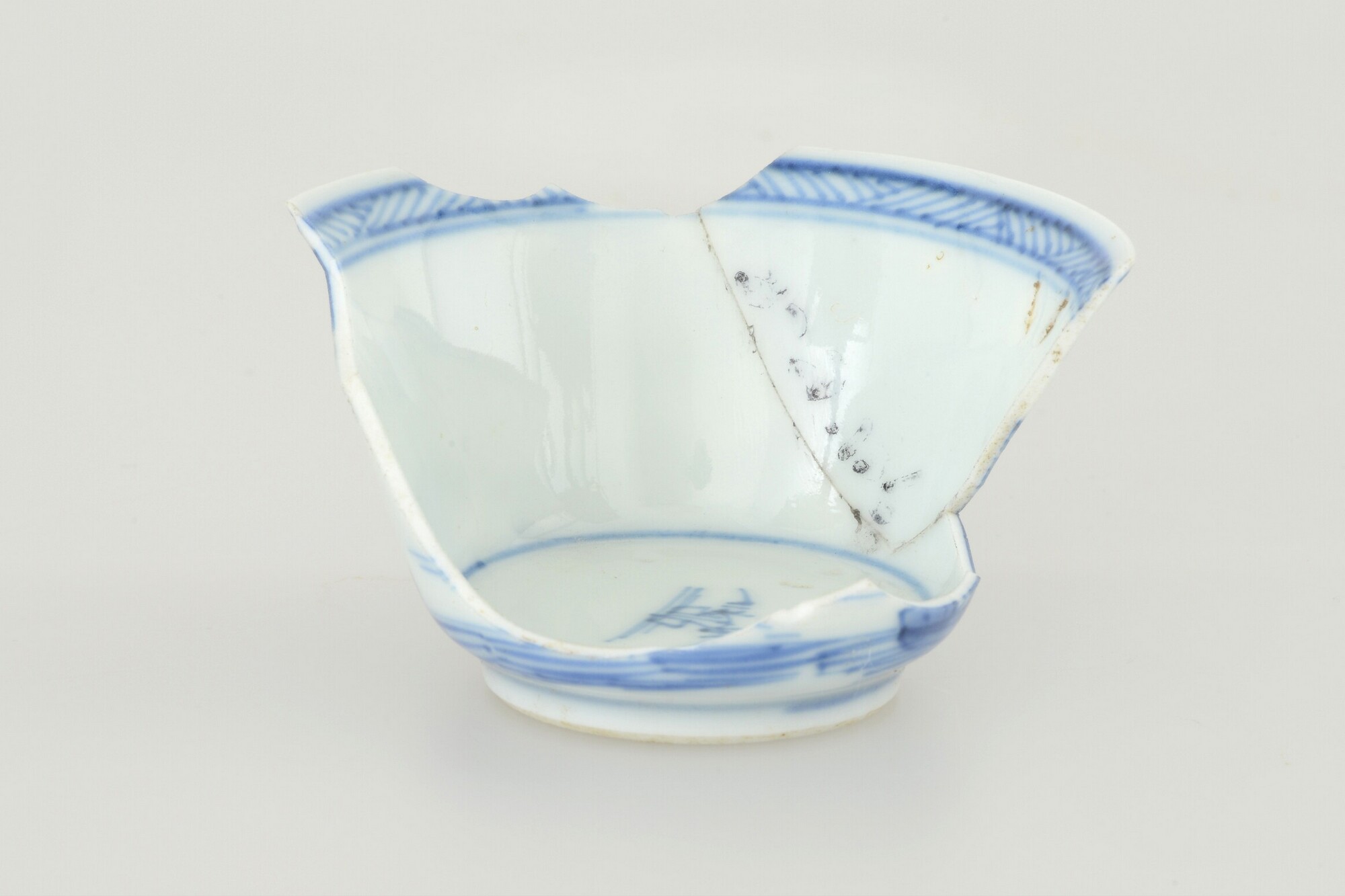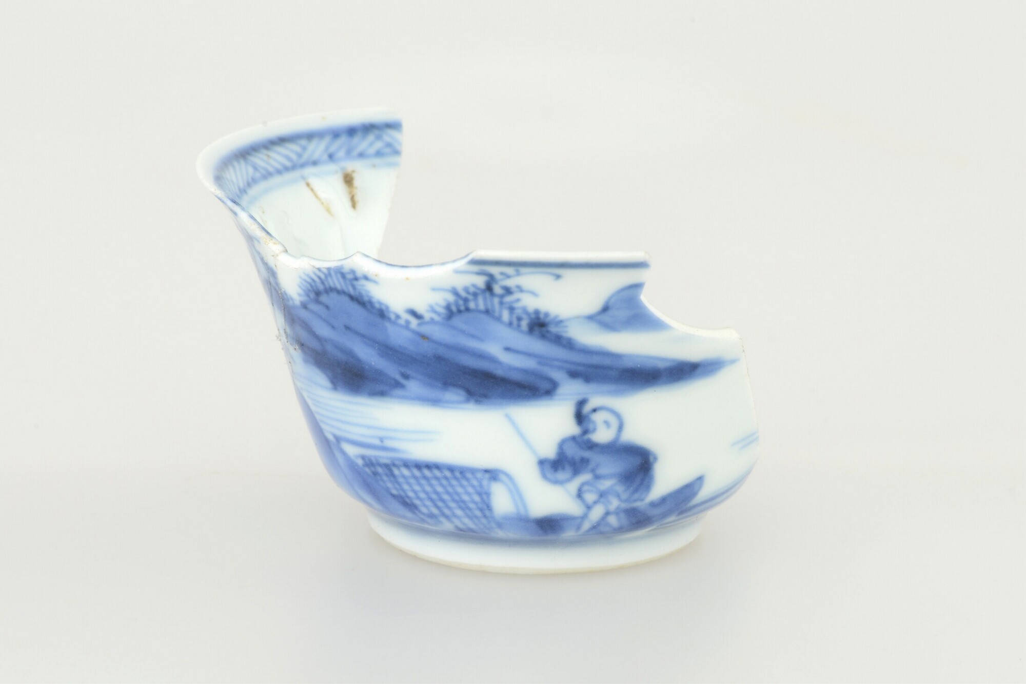 Kop; p-kop-1; kop met iets uitgebogen rand; Chinees porselein; veldspaatglazuur; blauwe beschildering: landschap met visser; standring; herkomst: China
