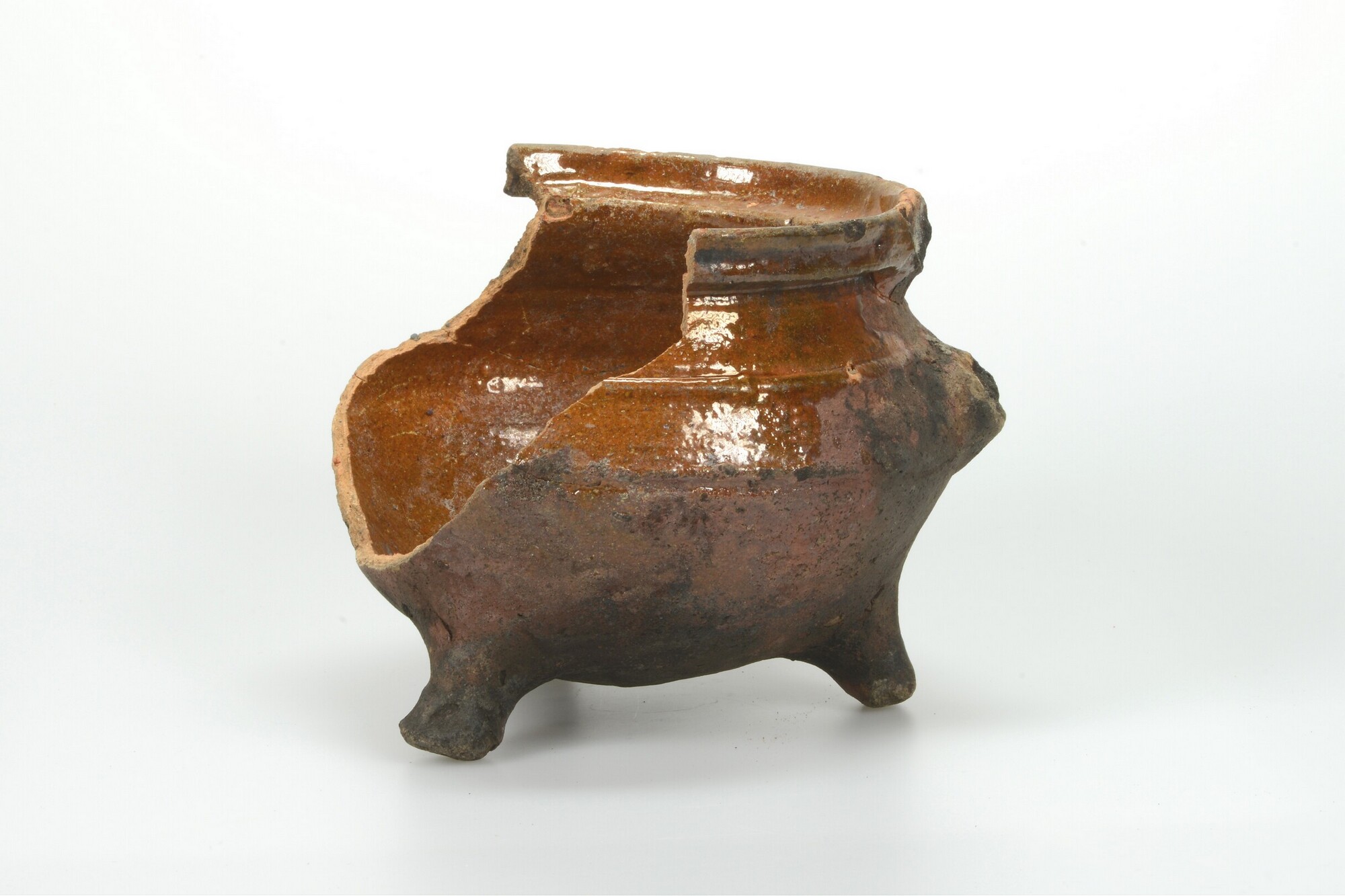 Grape; r-gra-34; grape met scherpe buikknik, ribbel op schouder en kraagrand; roodbakkend aardewerk; inwendig loodglazuur, uitwendig loodglazuur op schouder; drie poten; één worstoor (ontbreekt); buitenzijde licht beroet