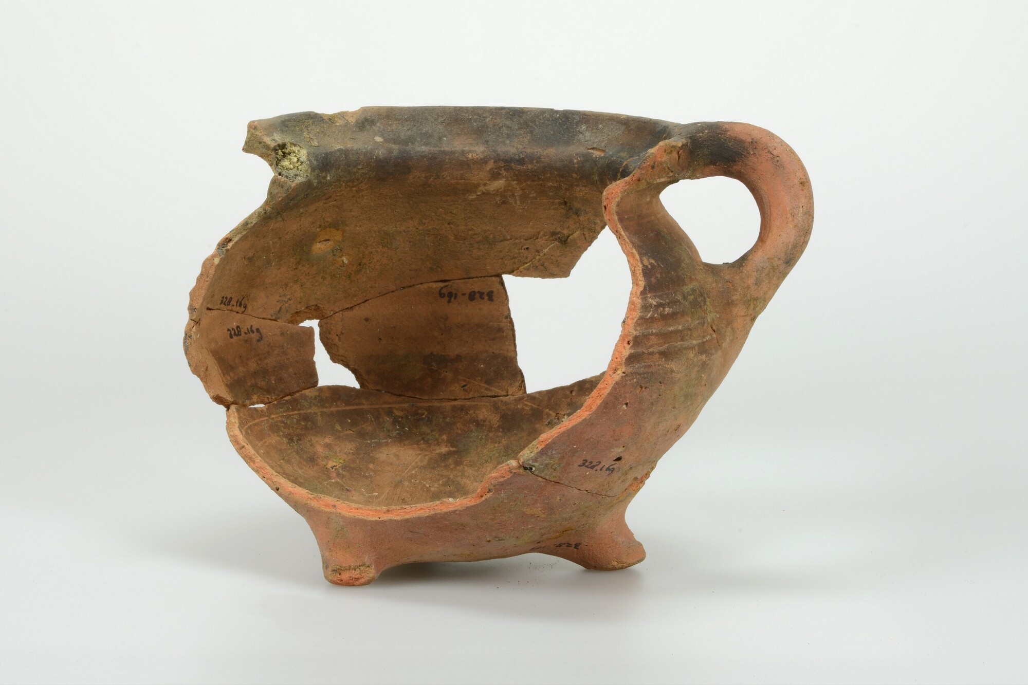 Grape; r-gra-8; grape met afgeronde buikknik en kraagrand; roodbakkend aardewerk; ongeglazuurd; draairibbels op schouder; drie poten; één worstoor
