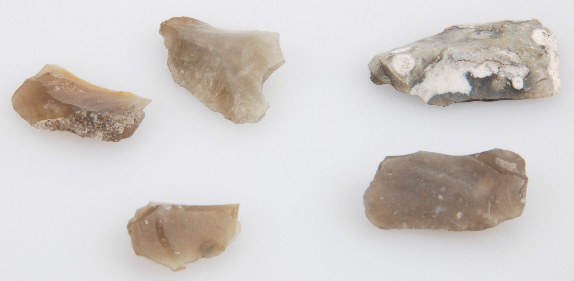 Schrabber/afslag; vijf stuks met duidelijke bewerkingssporen. Op één fragment bevindt zich nog restanten van kalk; vondstomstandigheden: HVS-laag