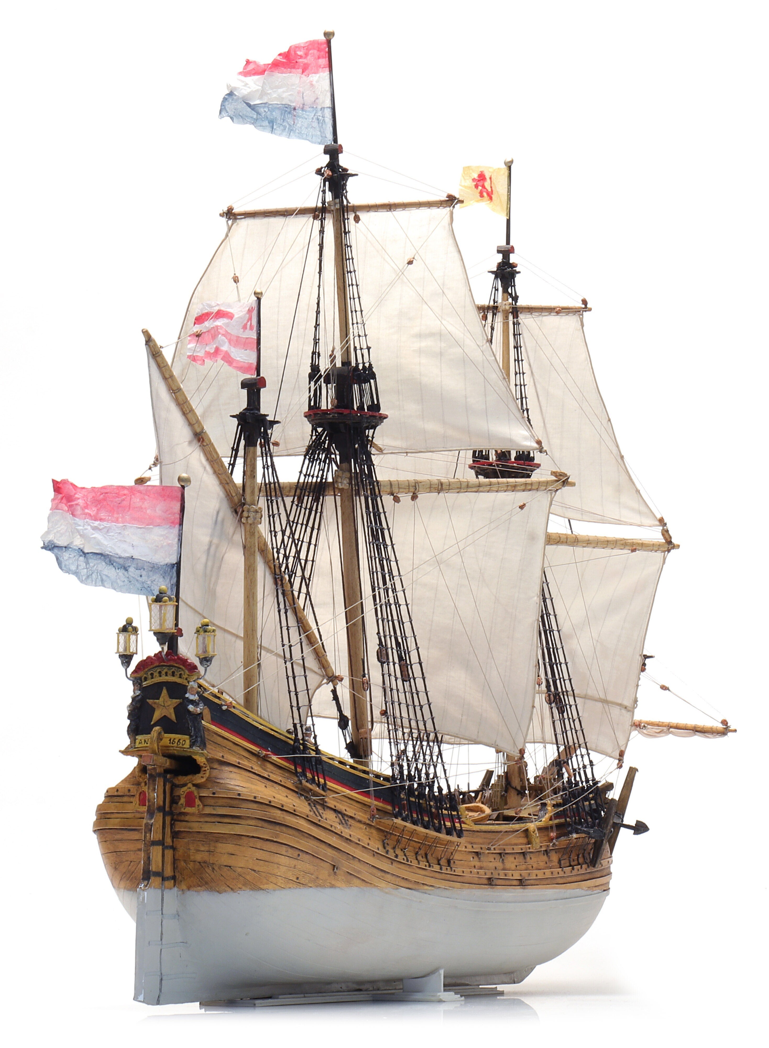 Replica van een fluitschip; 'gemeene' fluit voor algemeen gebruik; onbewapend vrachtschip; vaargebied: van Scandinavië tot Portugal met bulk- en stukgoed: zout, zuidvruchten, wijn, lederwaren, metaal, etc.; 125 voet.