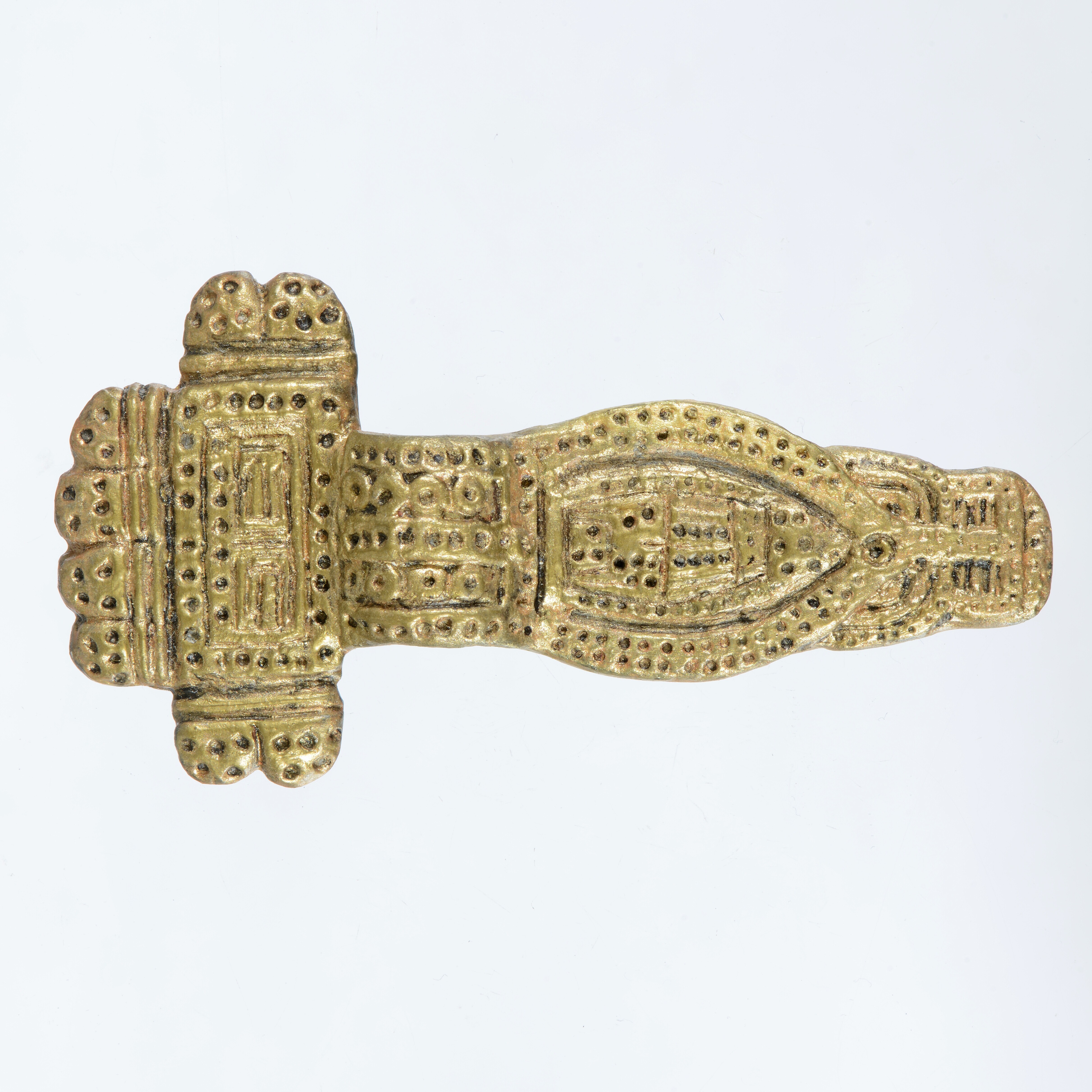 Beugelfibula; type Junkersdorf; ingekerfde versiering en bijna vlakvullende versiering met kleine ronde afdrukken. Bovenop de beugel zijn twee rijen van vier puntcirkels aangebracht en bovenop de gestileerde dierenkop in de voetplaat is nog een puntcirkel aanwezig