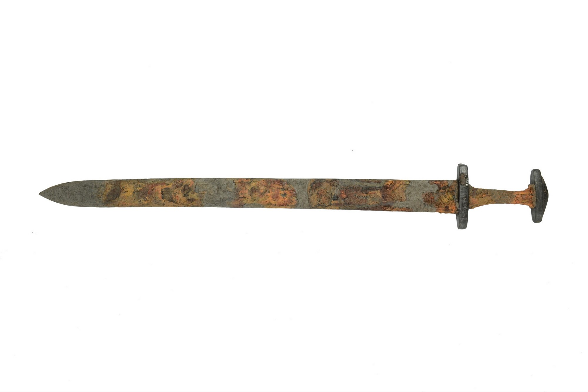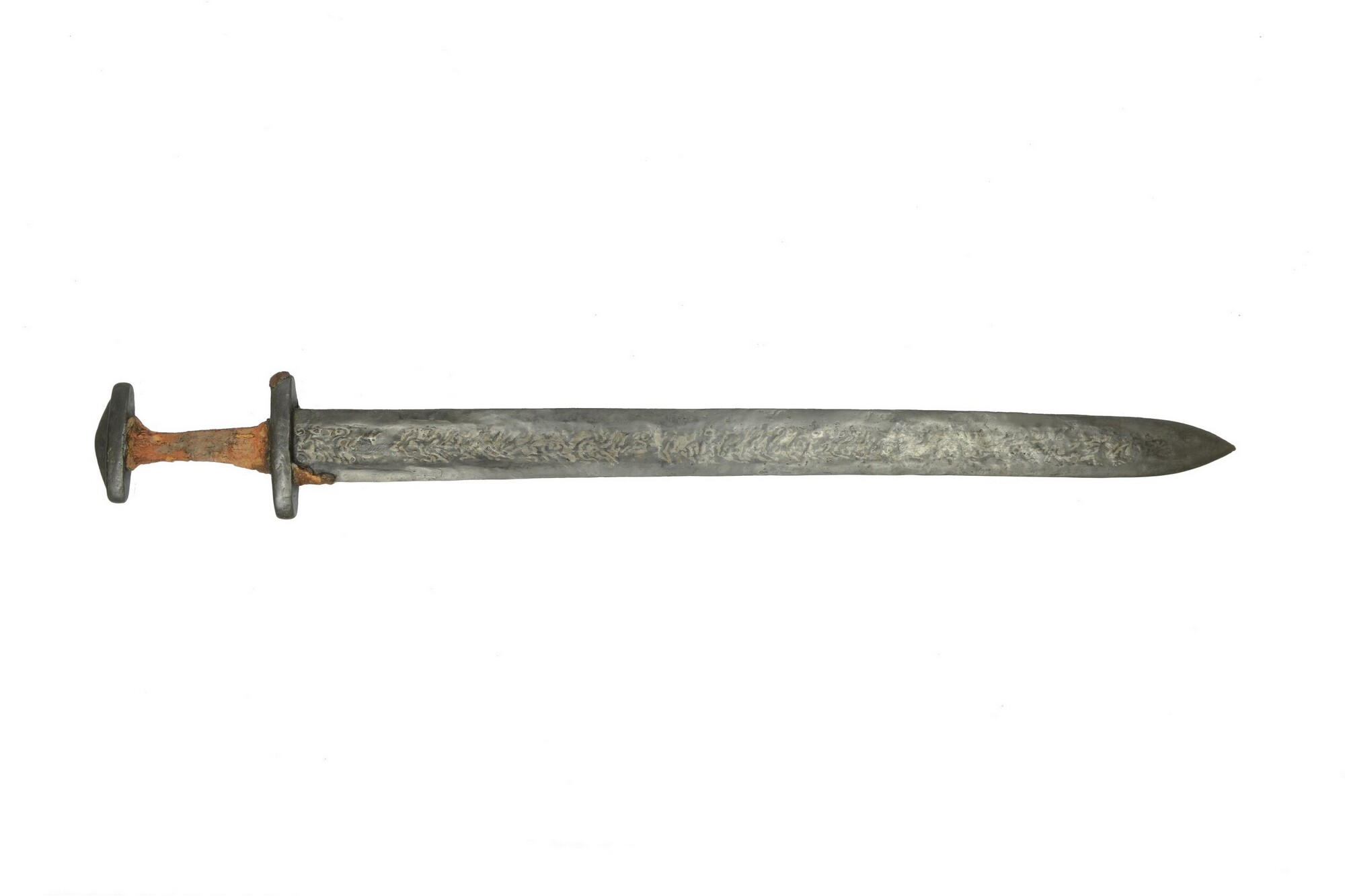 Replica tweesnijdend zwaard (spatha); waarschijnlijk valt dit zwaard onder het type Niederramstadt-Dettingen-Schwabmühlhausen. De kling meet circa 61cm en het gevest 14cm. De pareerstang is ongeveer 11cm breed. De kling is op diverse plaatsen ernstig gecorrodeerd. De pommel of zwaardknop is van massief ijzer, vlak driehoekig en net als de pareerstang onversierd. Op het gevest zijn ...