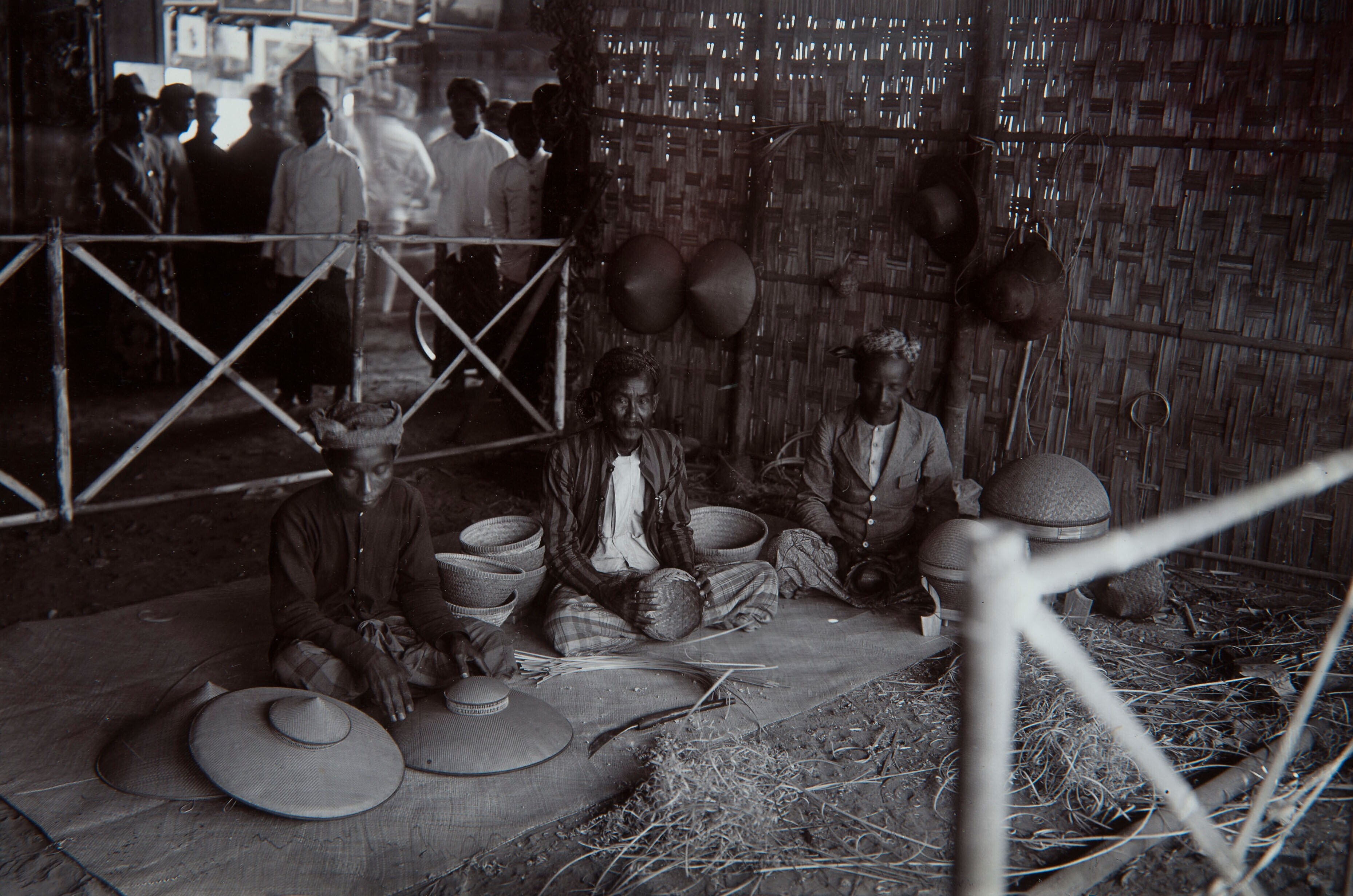 Vlechtwerk demonstratie op de eerste nijverheidstentoonstelling in Yogyakarta met op de achtergrond toeschouwers