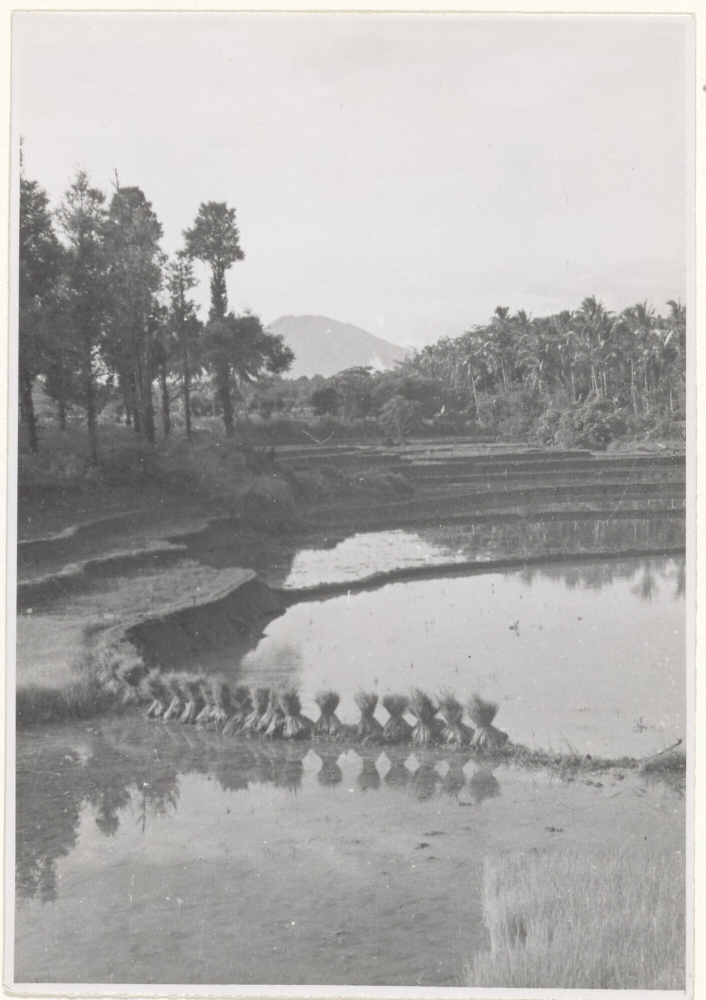 De padi staat gesnlen klaar op een sawah-dijkje, om naar Kromo's huis te worden gebracht. Op de achtergrond de vulkaan Merbaboe