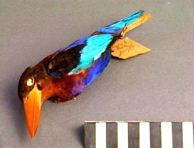 Opgezette ijsvogel, vermoedelijk bruinborstijsvogel (Halcyon gularis)