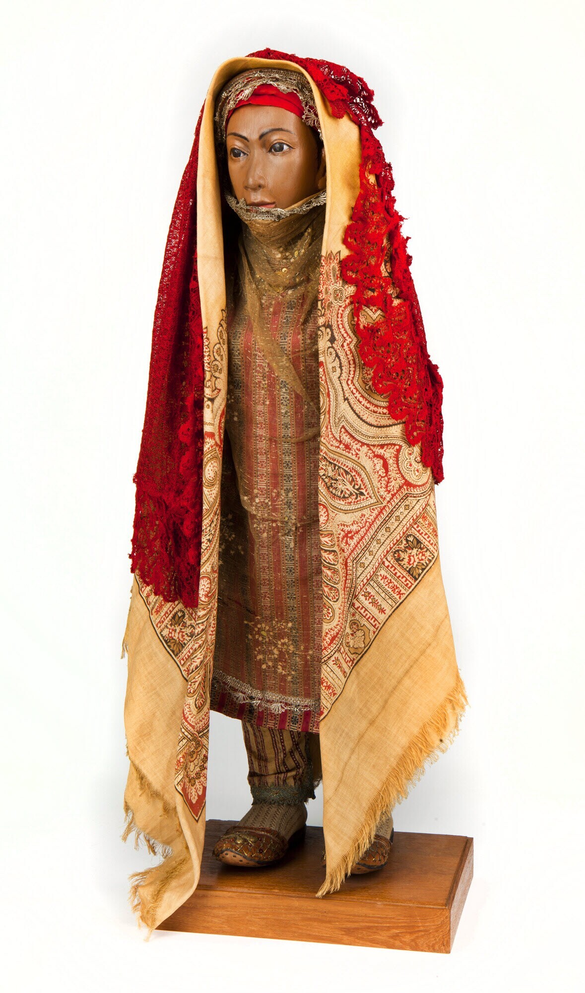 De vrouw is getooid met een halssieraad van vergulde kralen en Arabische munten en polsringen. De broek is van dezelfde stof vervaardigd als de jas van haar man (1108-1). Aan haar voeten draagt ze witgeborduurde sokken en roodfluwelen sandaaltjes, versierd met bladfiguren van goudpassement en lovertjes. Het poppenpaar is onder toezicht van het Hoofdcomité in de ...