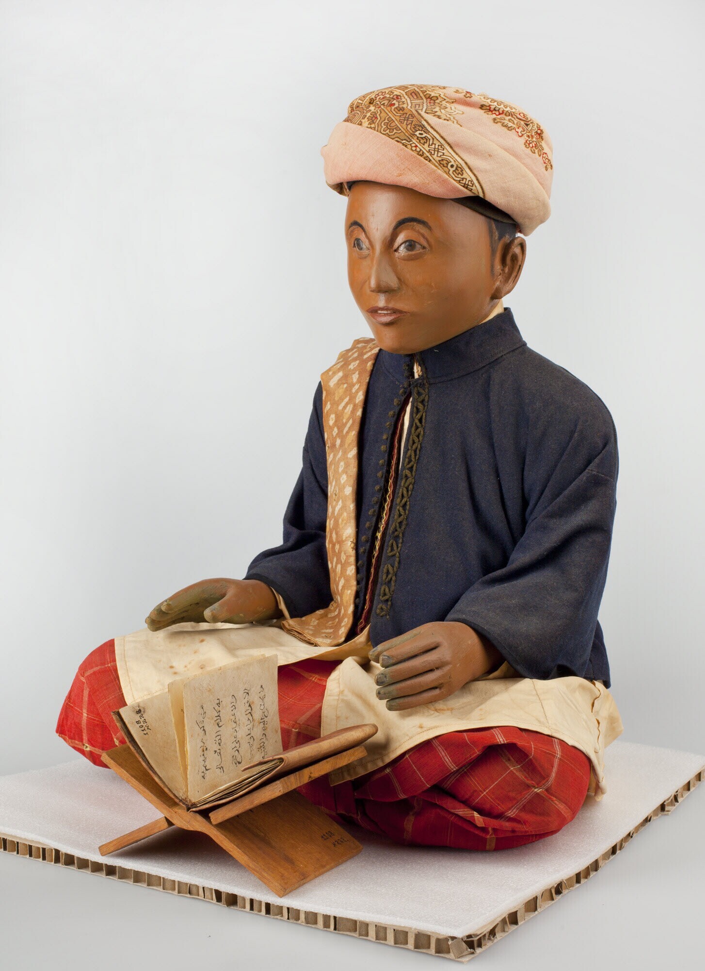 De leraar draagt een zwartkatoenen kupiah (islamitisch hoofddeksel) waaromheen een tulband is gewikkeld. Over zijn rechterschouder is een schouderdoek (slendang) versierd met bloemen gedrapeerd. De heupdoek is versierd met een ruitpatroon. Op de lessenaar (rekal) voor hem ligt een Kitab Tafsir, een boek met uitleg van de koran.
