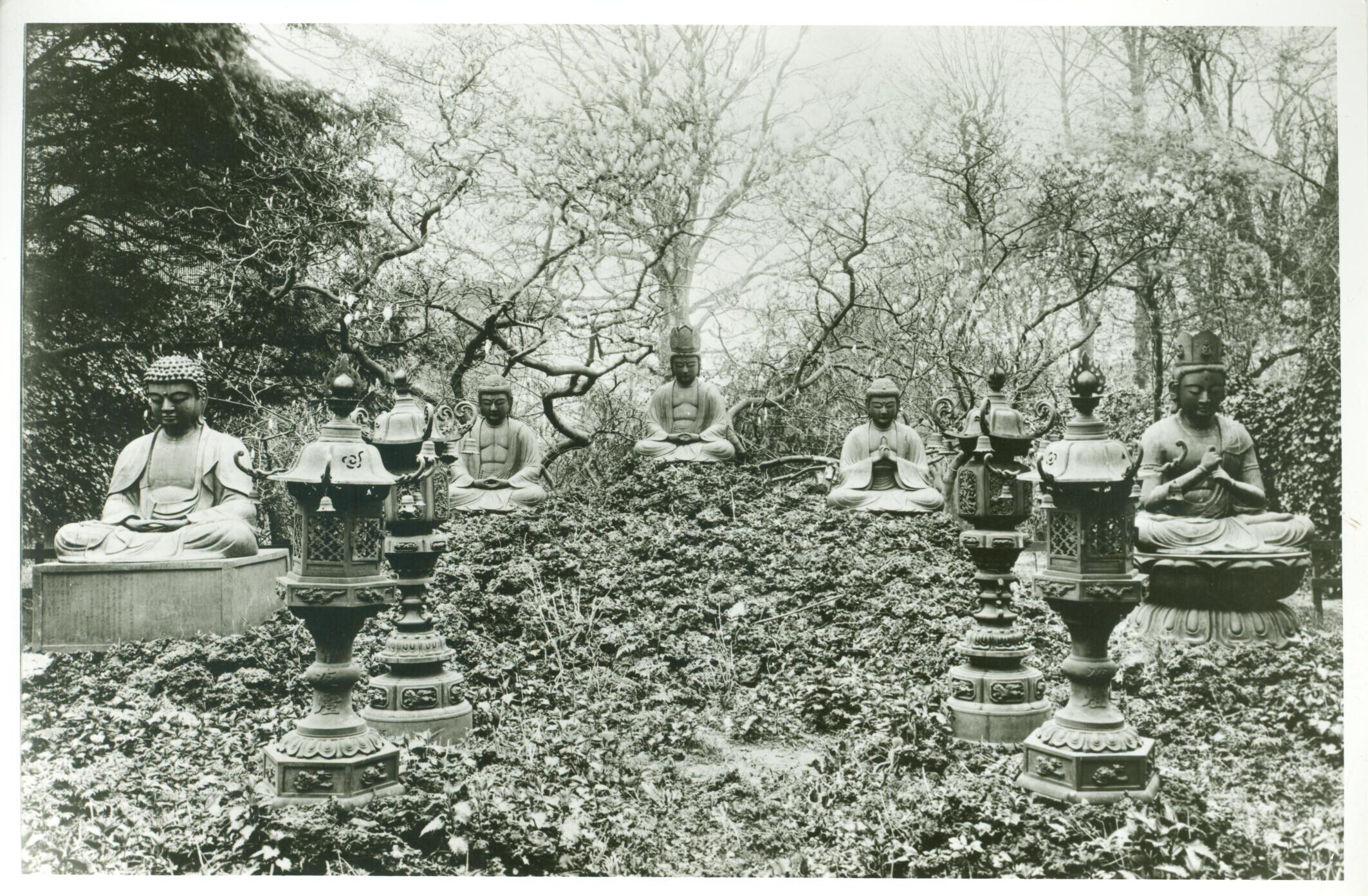 RmV Boeddha-beelden tuin Rapenburg met achterop tekst, div reliefs, beelden.
