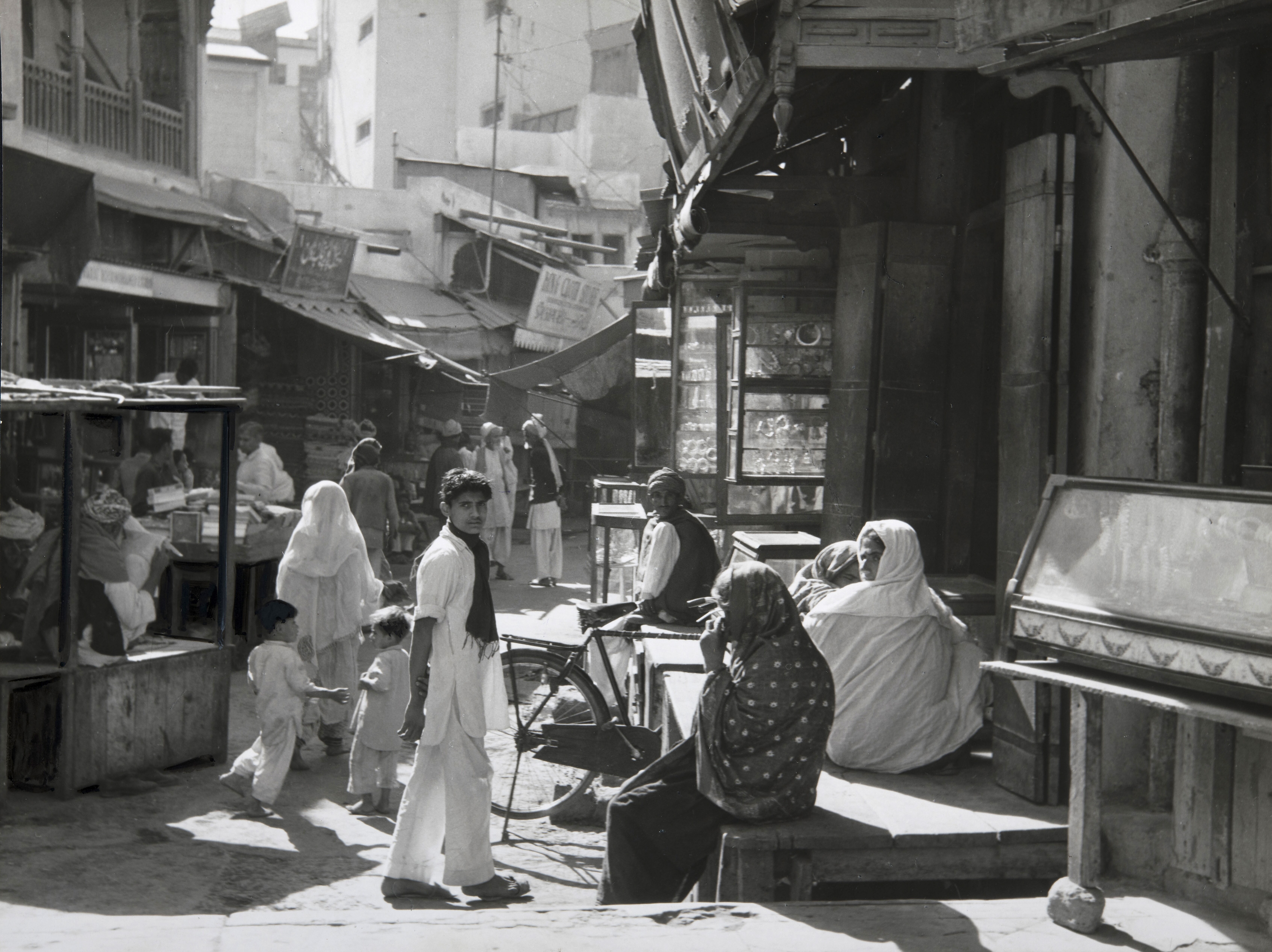 Straatbeeld van een winkelstraat, met mensen zittend op de stoep, voetgangers en glazen uitstalkasten