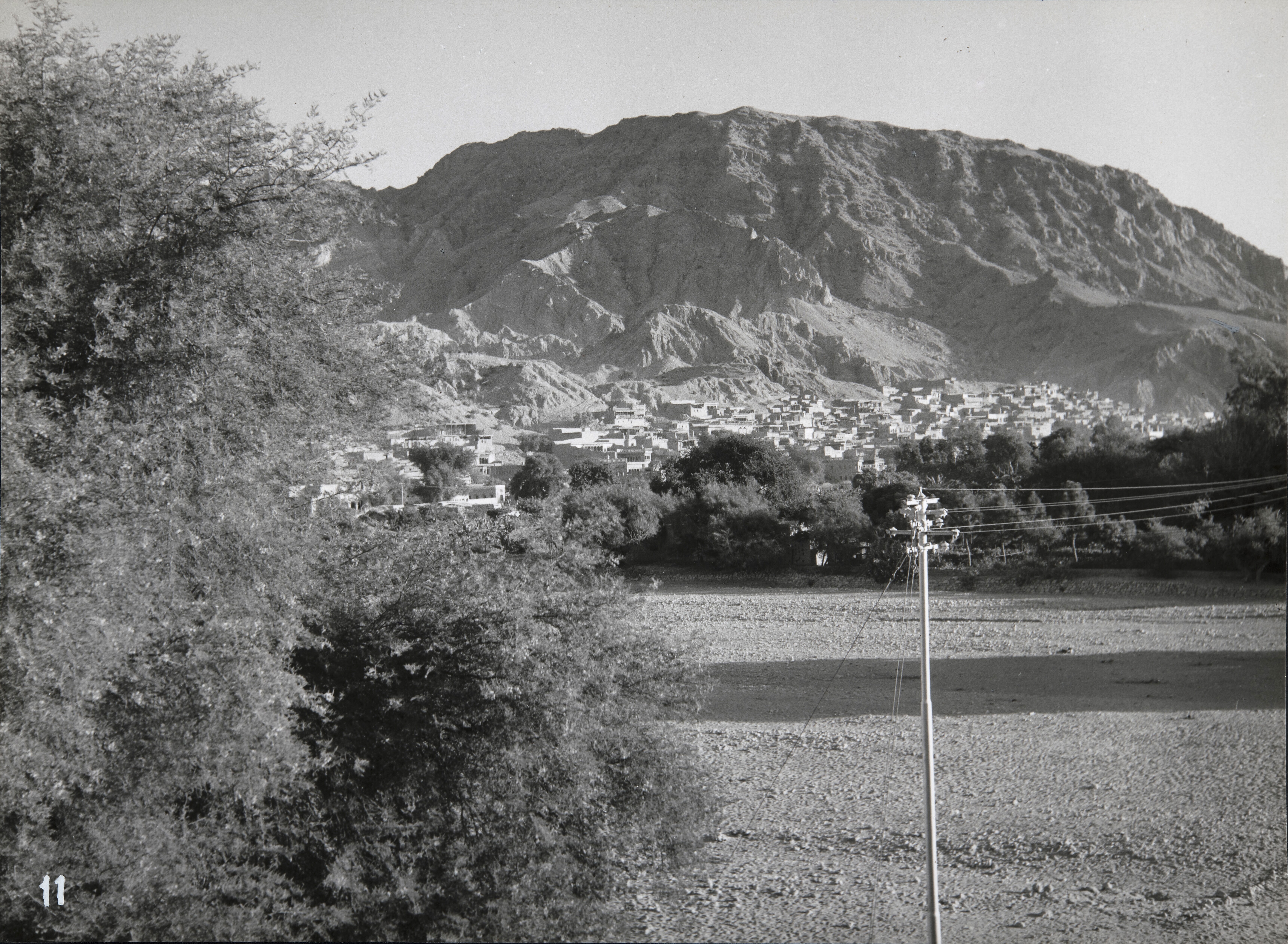 Landschap met de stad Kalabagh in de verte en gebergte op de achtergrond