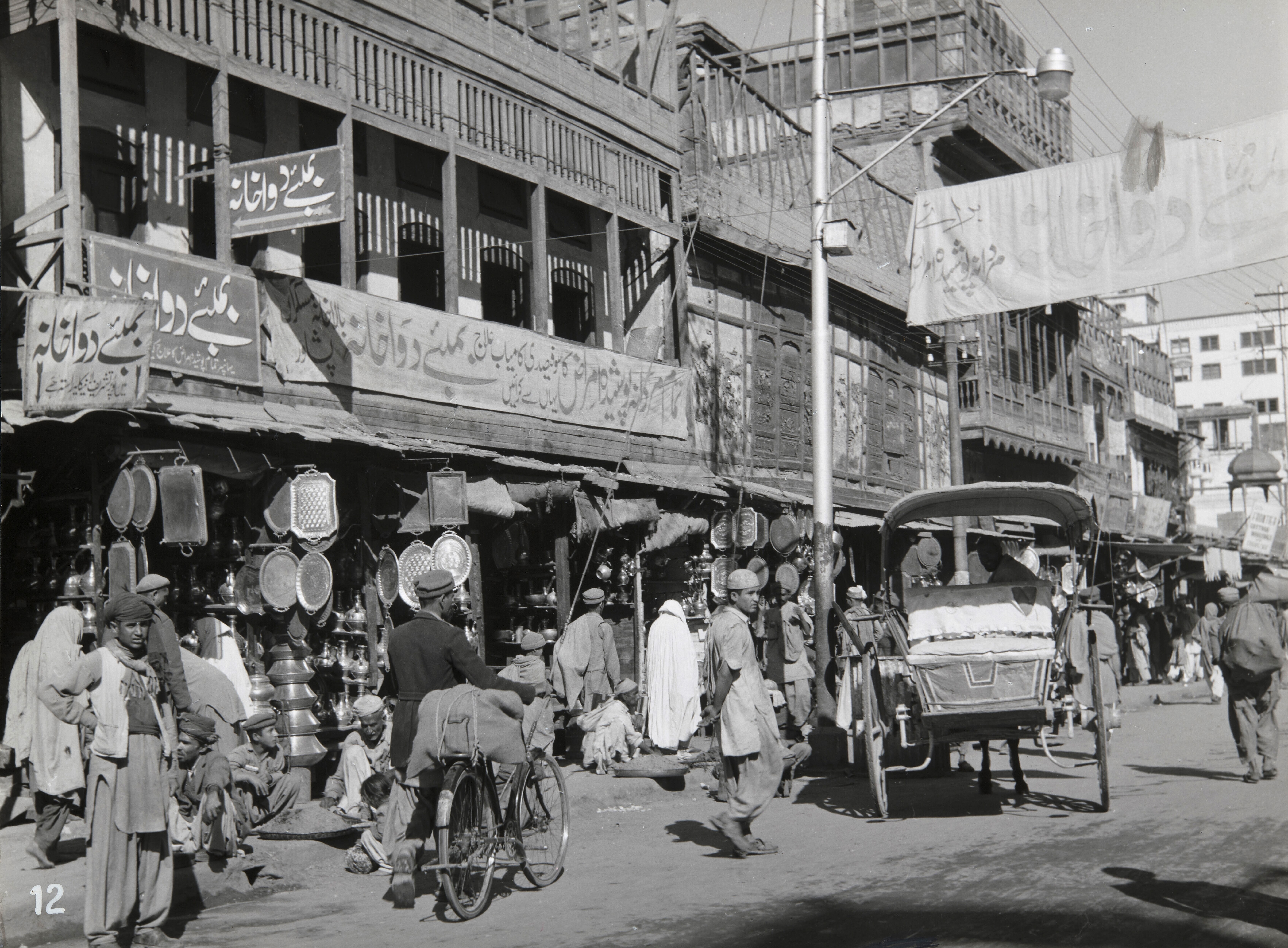 Winkelstraat met koets en fiets en veel voetgangers
