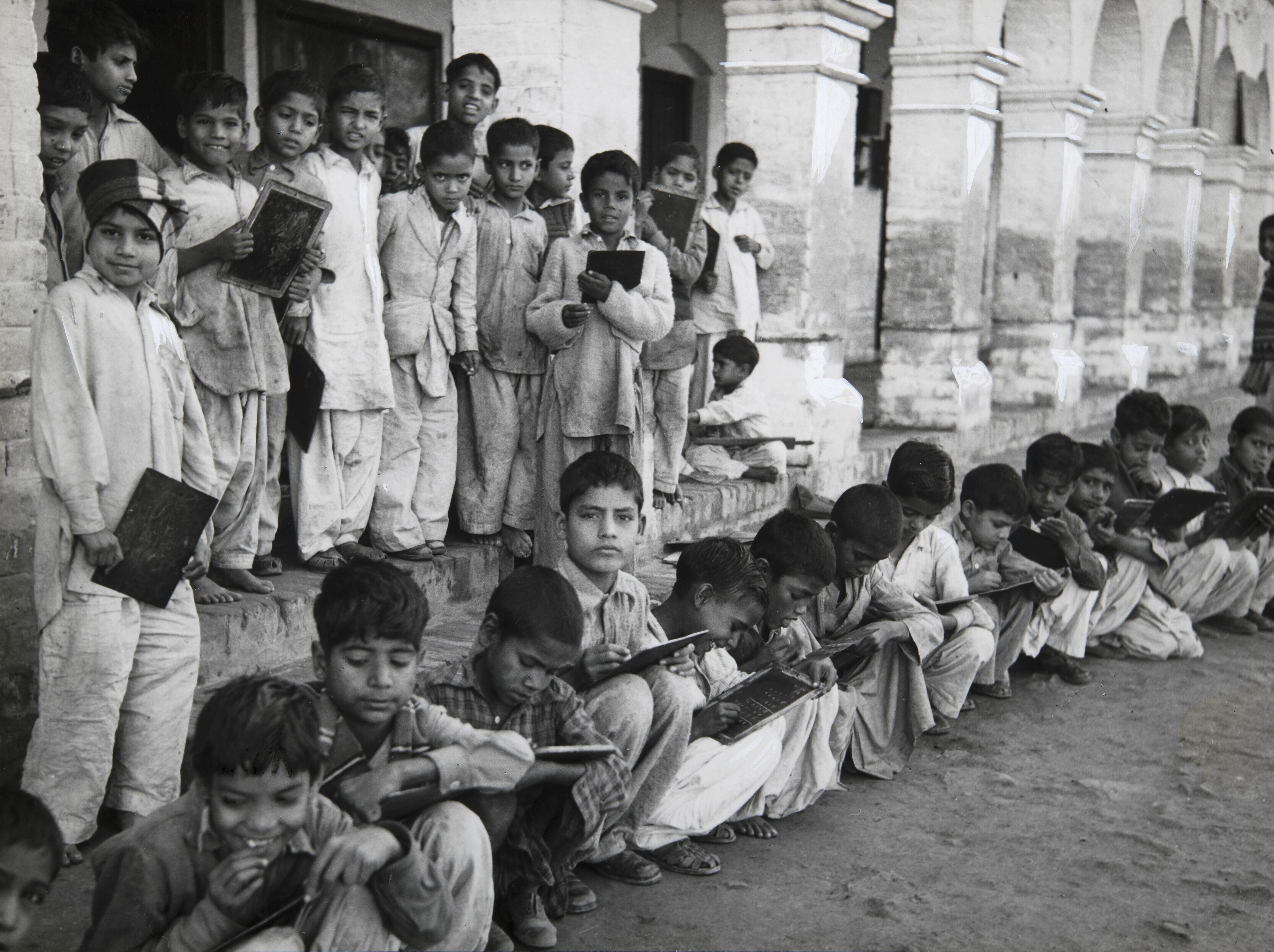 Groep schoolkinderen met een schrijfbord