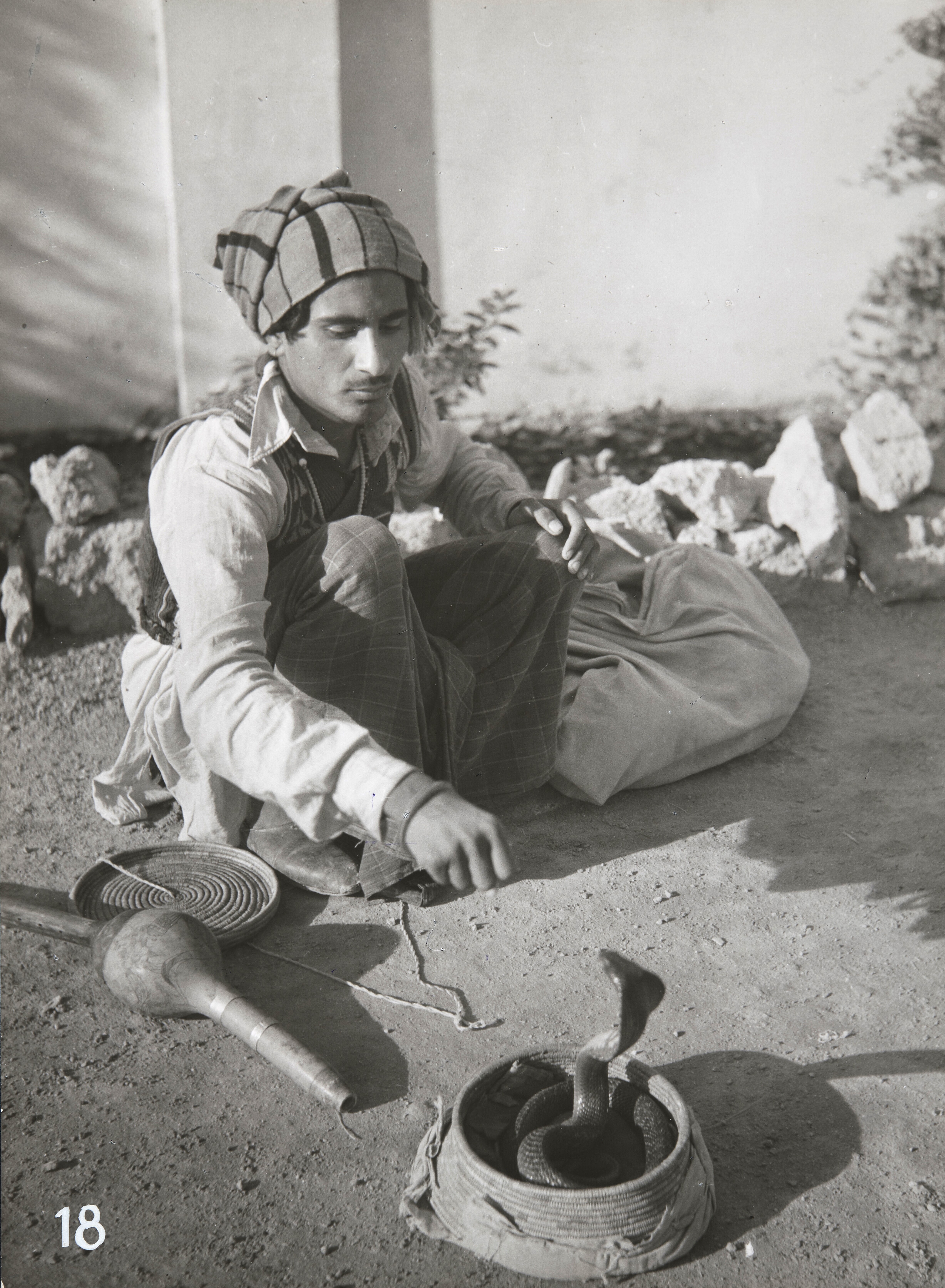 Portret van een man met een slang in een mand