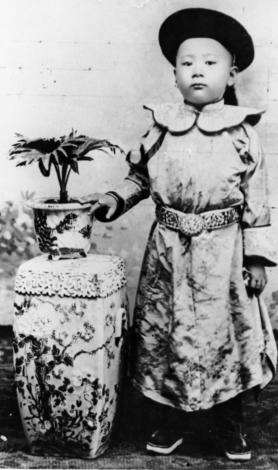 21. De oudere heer van foto 17 als jongen van 10 jaar in traditioneel Chinese kleding. Surabaya, 1900.
