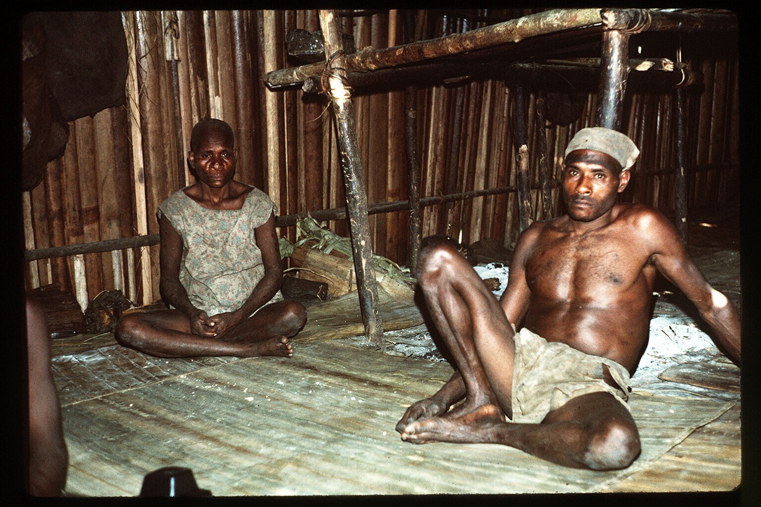 Flashlight interiors of the house of Serew, now blind on both eyes (village people having applied magic) and the kusjfe he has. Several CU of the kusjfe. Last of series few shots of his wife at fire place. too dark (onbruikbaar)