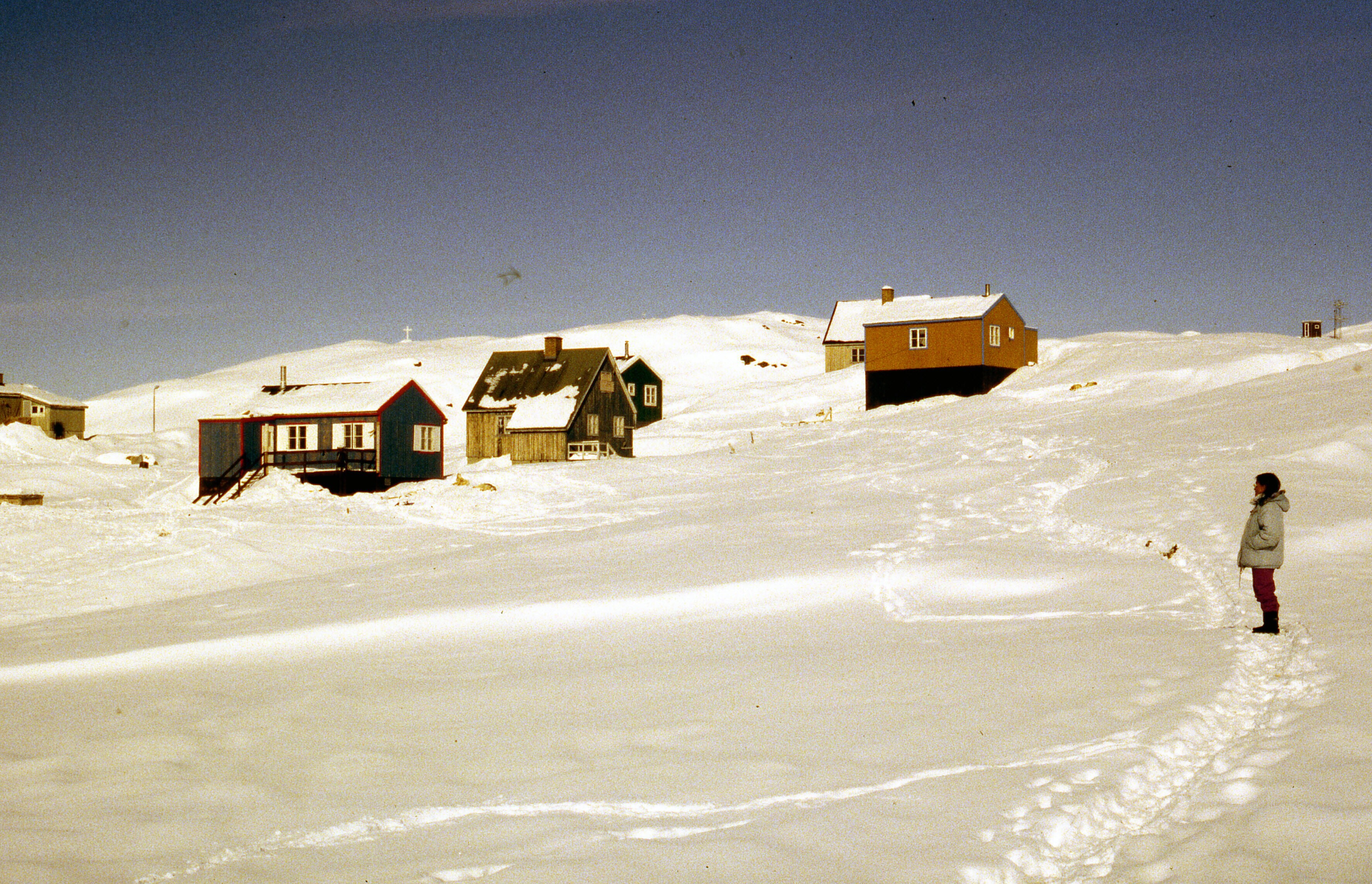 Huizen van Tniteqilaaq in de sneeuw, overdag, maart .