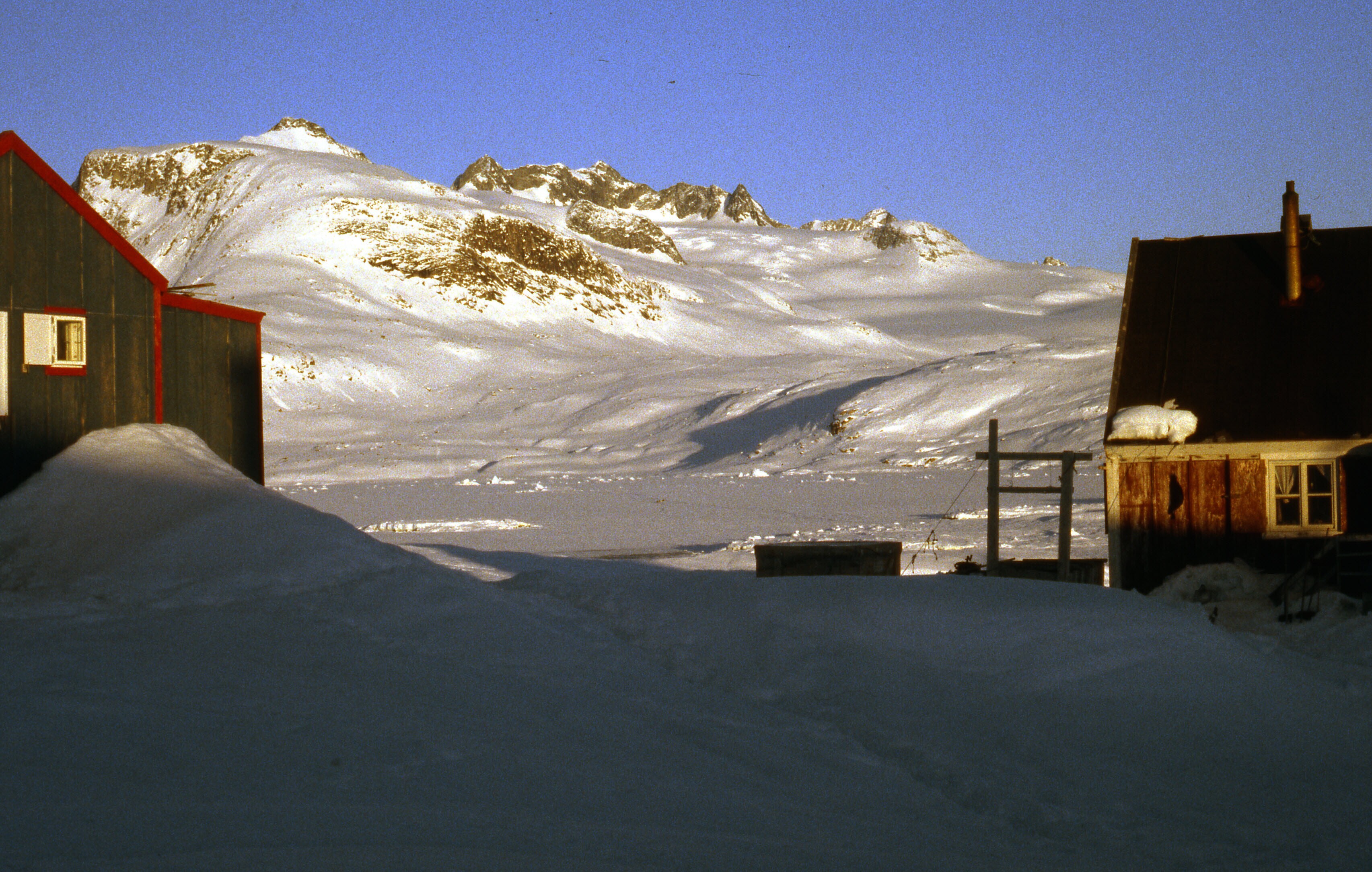 Zicht op Tiniteqilaaq in de sneeuw, bij avondlicht, eind april .
