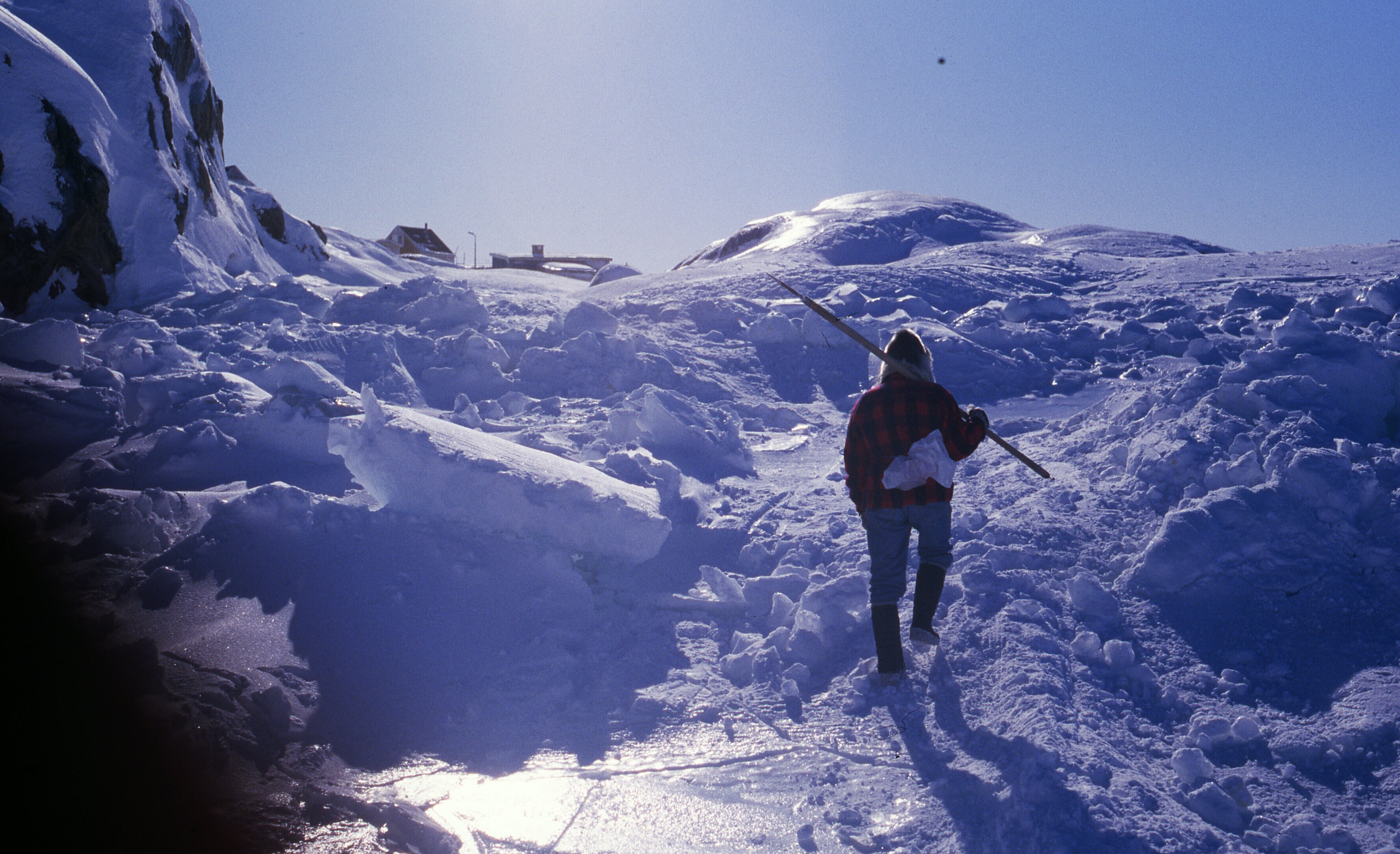 Lars Jonathansen op weg terug naar huis door de vastgevroren ijsformaties op de Sermilik fjord, in de nabijheid van Tiniteqilaaq, maart . Hij heeft een ijspriem en ander gereedschp bij zich, nodig om seehondennetten uit te zetten.