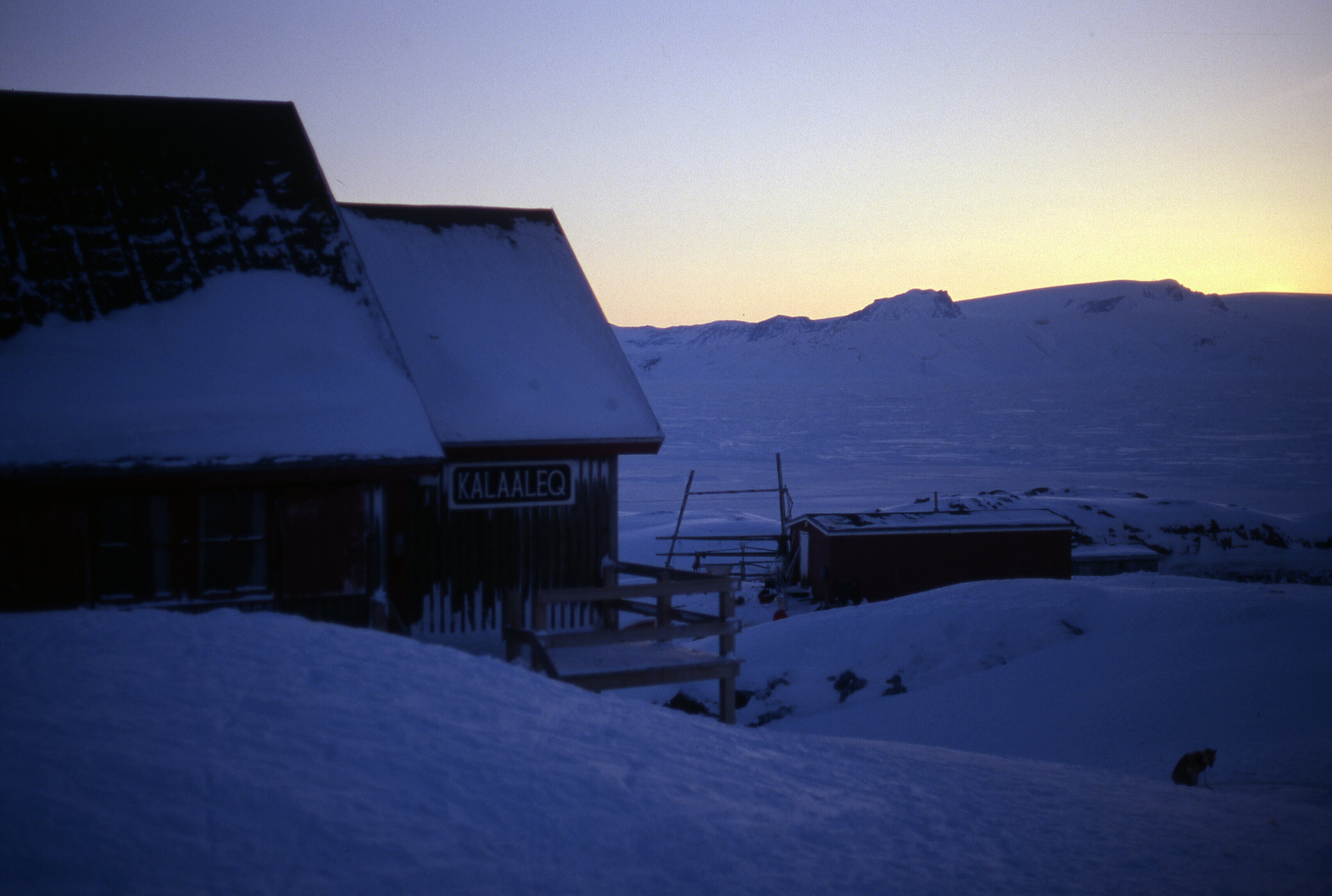 Het dorpshuis van Tinteqilaaq met opschrift 'Qalaaleq' ('Groenlander'), hier worden dansavonden gehouden en openbare bijeenkomsten vinden er onderdak (zoals op vrouwendag of bv. tijdens de verkiezingen). April .