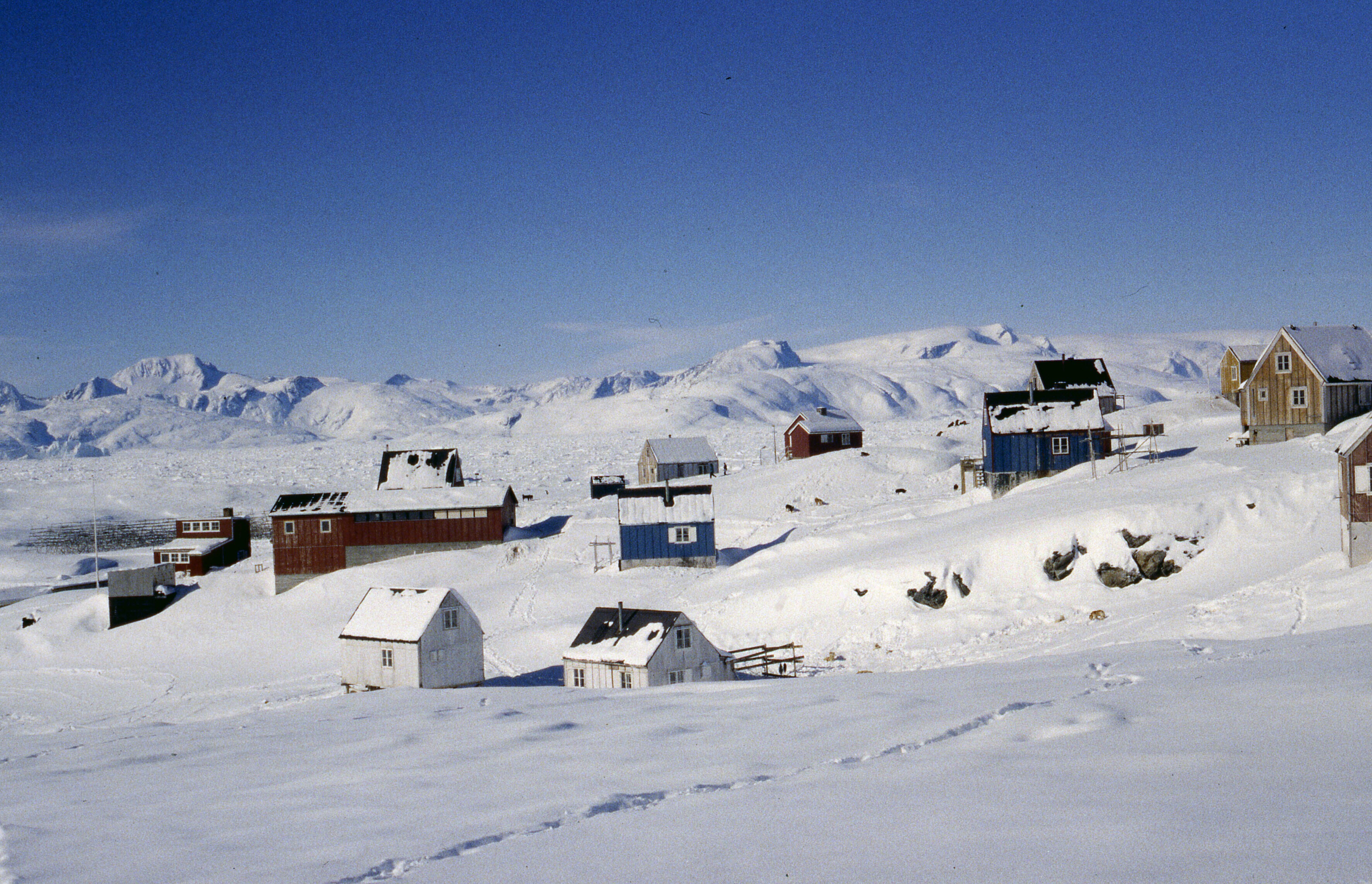 Zicht op Tiniteqilaaq in de sneeuw, vanaf de dichtgevroren haven. Maart .
