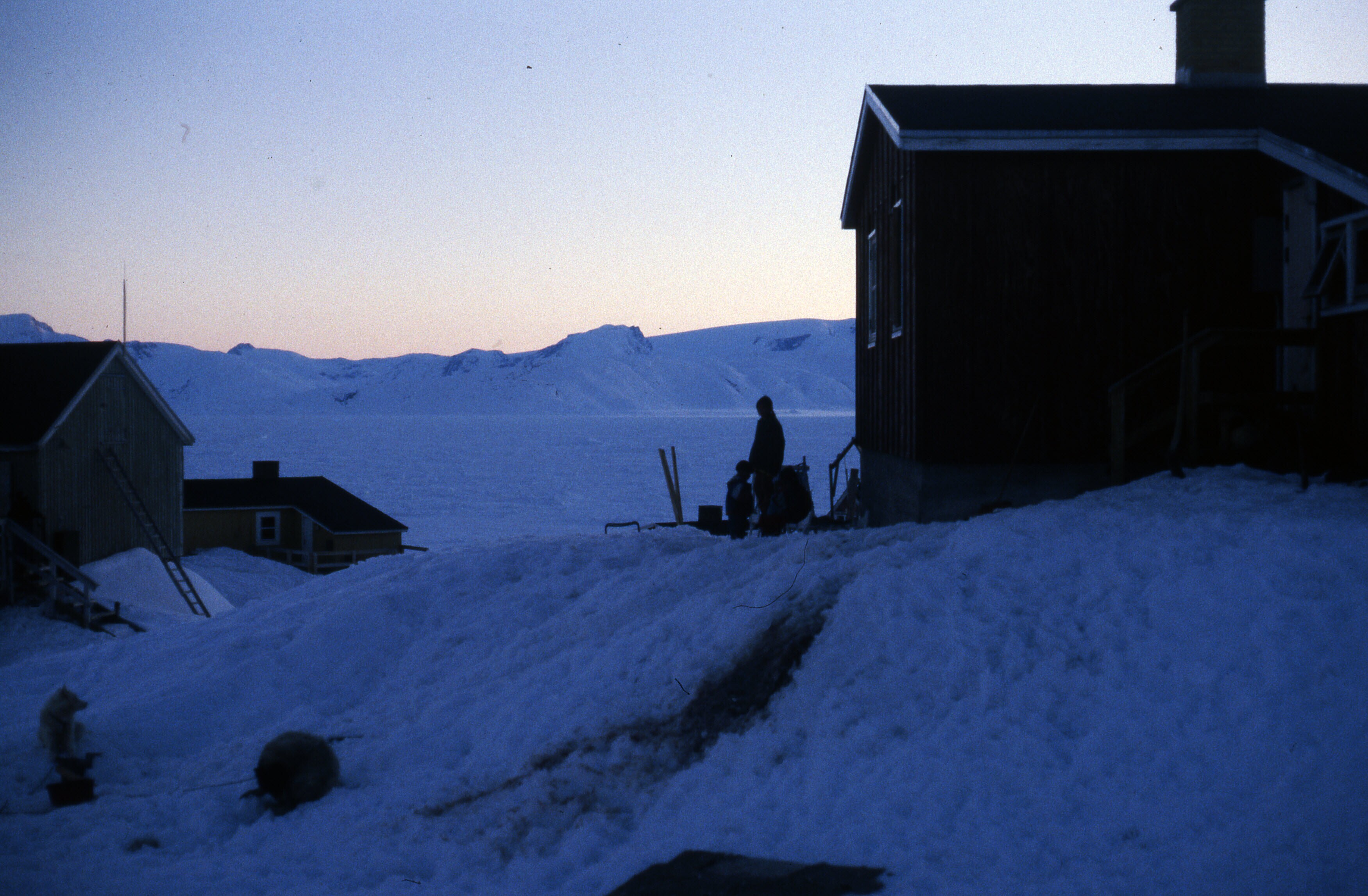 Iemand zit buiten op de uitkijk over de Sermilik fjord, naast een hoger gelegen huis in Tiniteqilaaq, maart-april