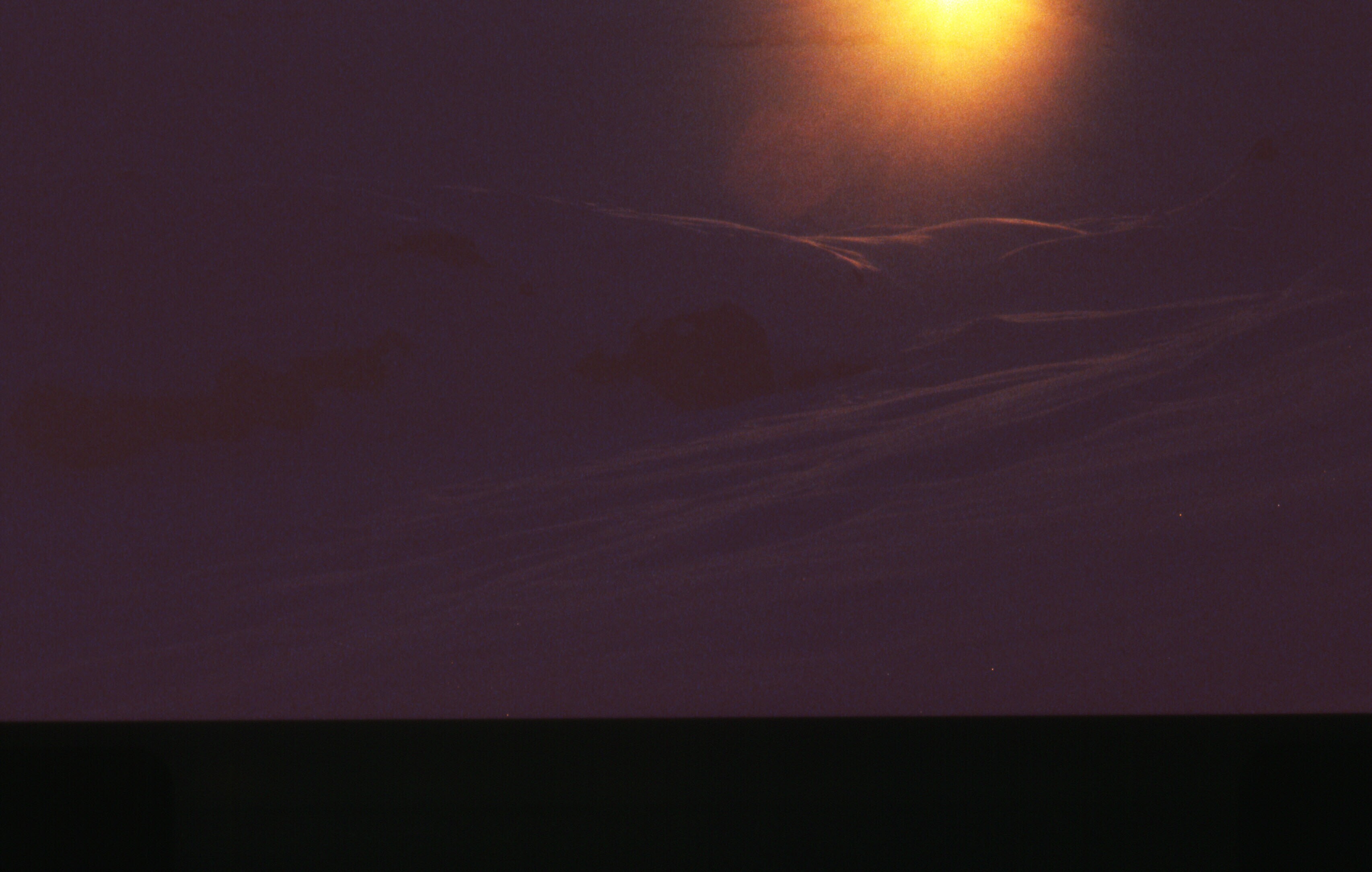 Ondergaande zon in de besneeuwde bergen in omgeving van Tiniteqilaaq, maart-april .