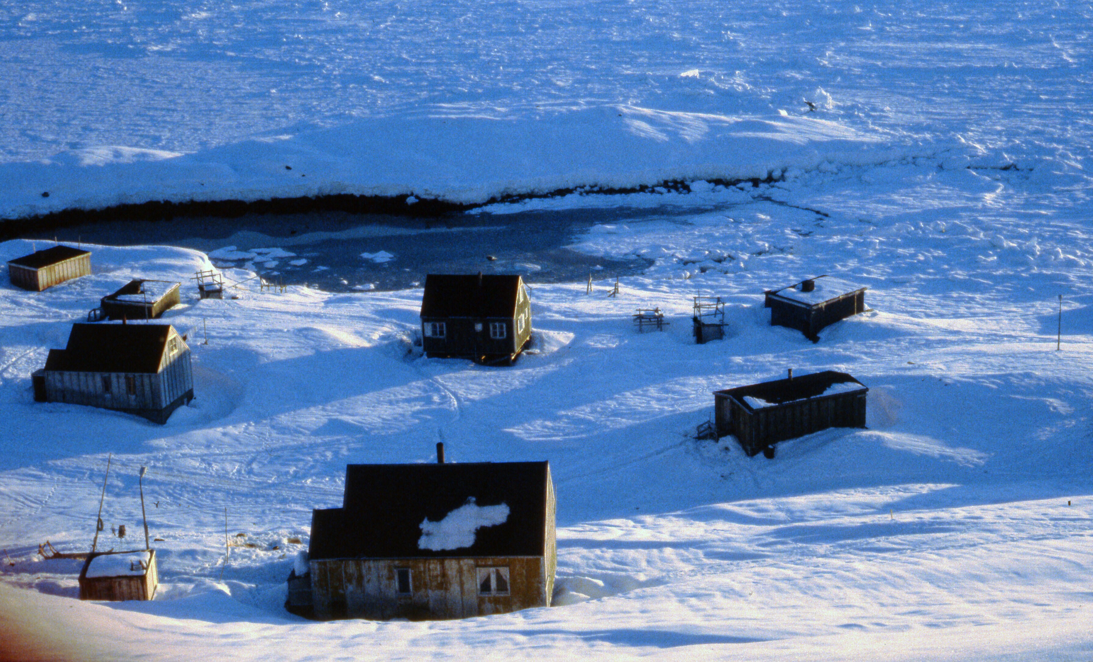 - Uitzicht over enkele huizen van Tiniteqilaaq, gelegen in de sneeuw aan de voet van de berg en aan de bevroren Sermilik-fjord. Tiniteqilaaq, maart-april