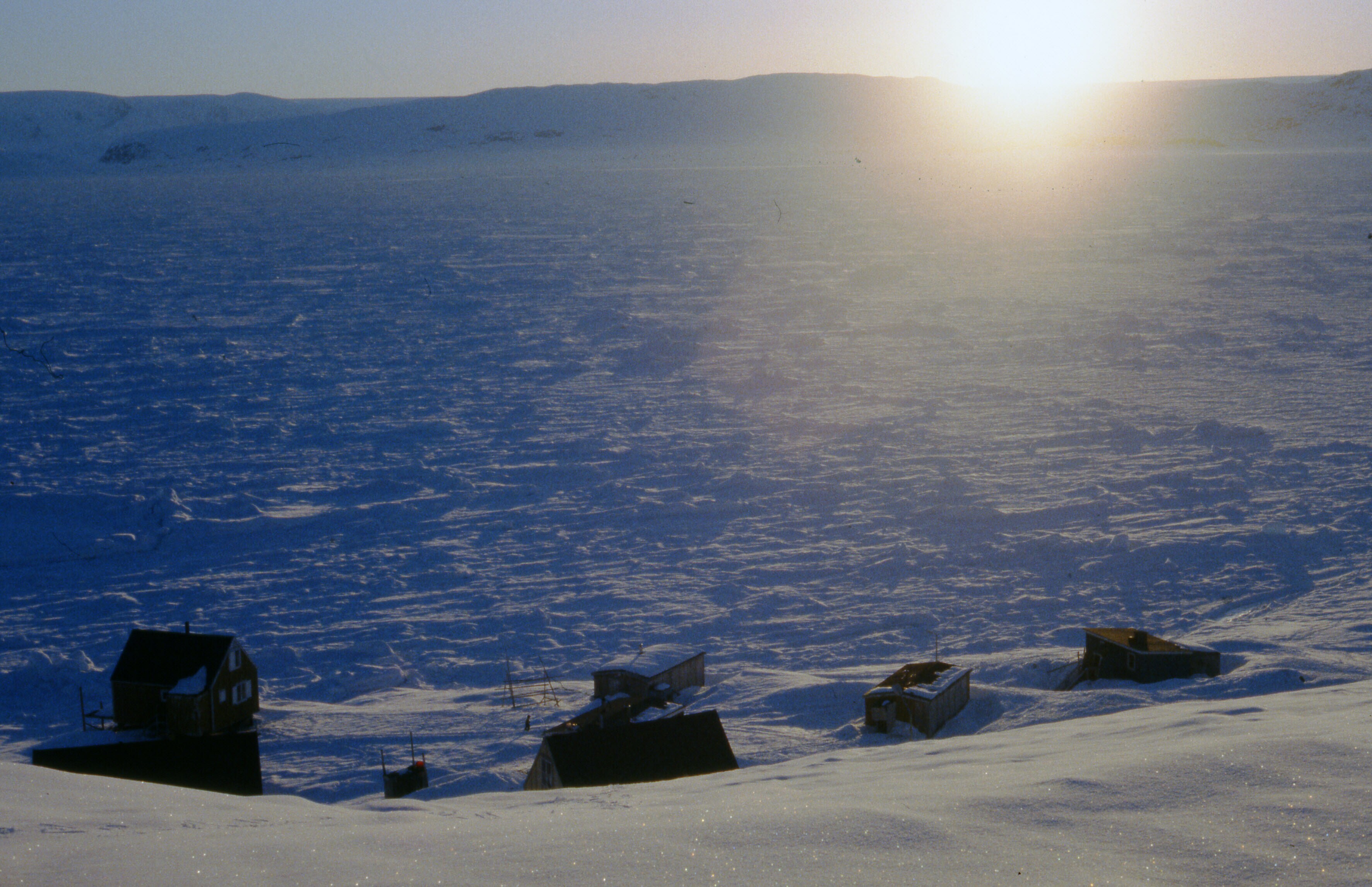 - Uitzicht over enkele huizen van Tiniteqilaaq, gelegen in de sneeuw aan de voet van de berg en aan de bevroren Sermilik-fjord. Tiniteqilaaq, maart-april