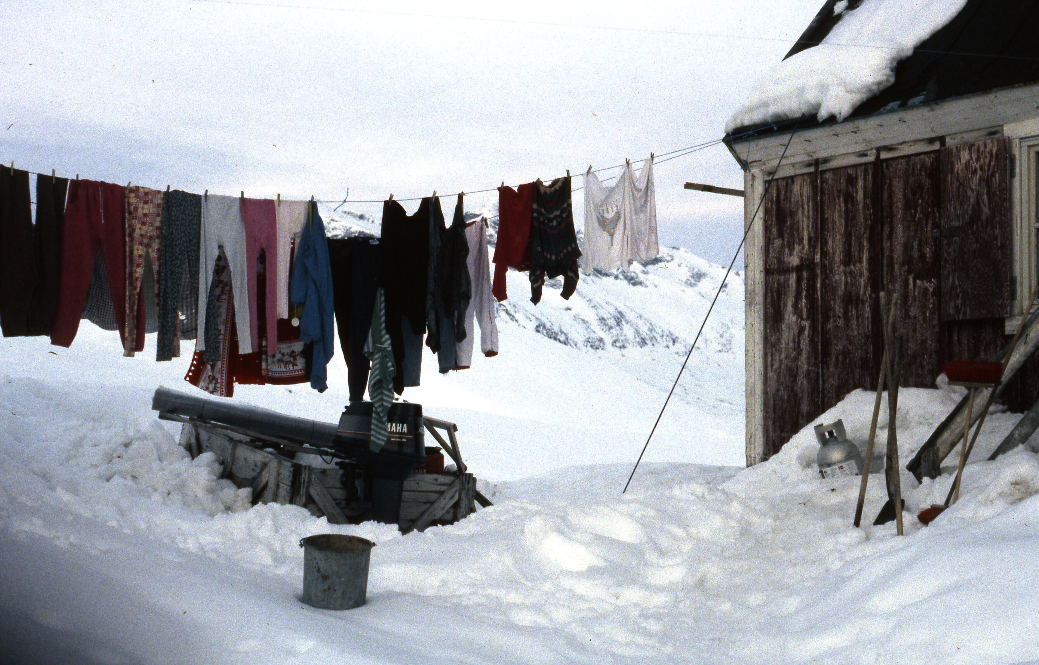 - Het huis van Lars en Asta Jonathansen gelegen aan de rand van het dorp in de sneeuw. Aan de waslijn hangt de was. Tiniteqilaaq, maart-april