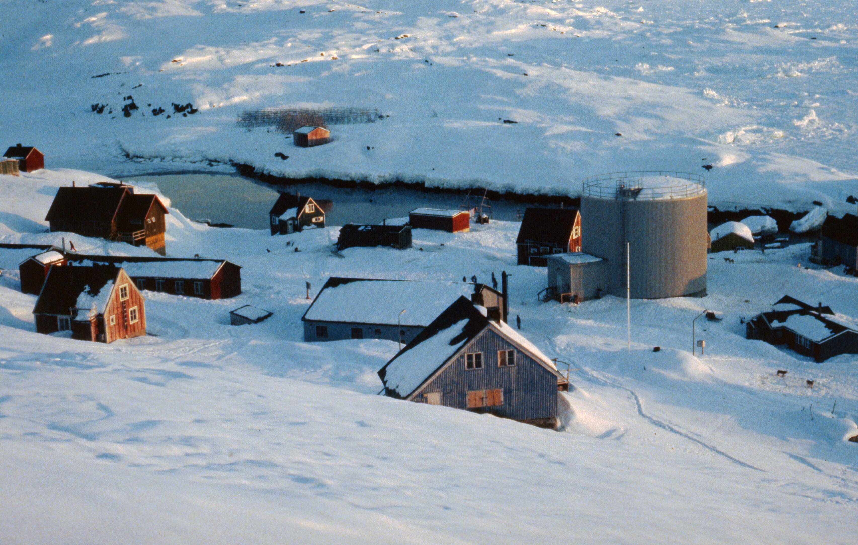 - Uitzicht over enkele huizen van Tiniteqilaaq, gelegen in de sneeuw aan de voet van de berg en aan de bevroren Sermilik-fjord De watertank die de watervoorzinning voor het dorp regelt, ligt midden in het dorp. Tiniteqilaaq, maart-april